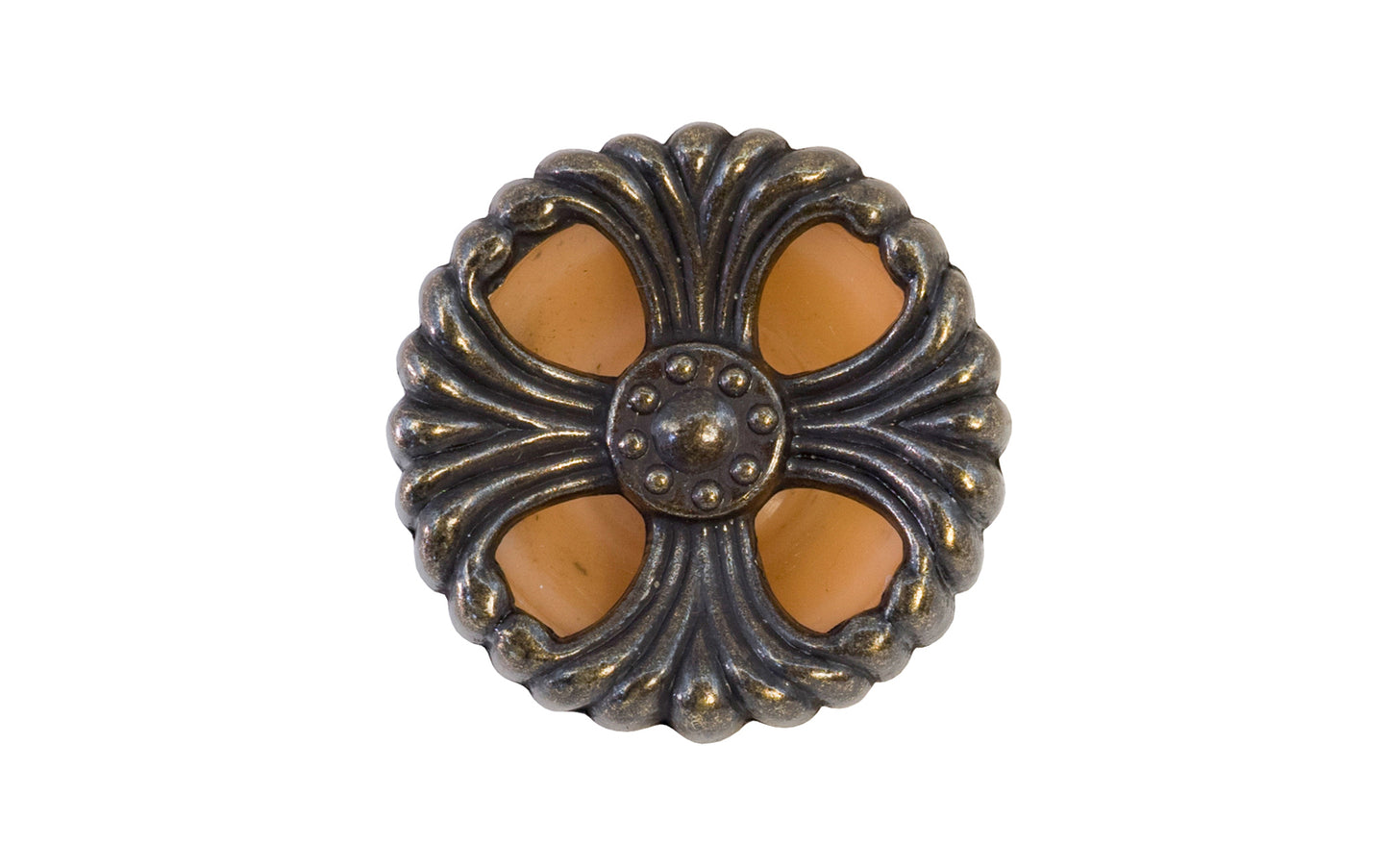 A special & unique cabinet knob originally designed in the "Waterfall-style" and or "Art Moderne" style of hardware popular in the 1930's. The knob is made of durable zinc material with an antique brass finish, and the knob has a bakelite insert inside. The inside bakelite plastic part is a tan brownish color with some designed light streaks and specks of black and white colors in the plastic insert. No two bakelite inserts are the same, & may have different streaks & specks for each one. Timeline Style: Early 20th Century, Waterfall, Art Deco, 1930's, Depression Era.Hardwick & Sons is pleased to offer vintage-style hardware for the many people who desire to fashion their homes with charm, quality, & style. The traditional-style hardware that we showcase are true & faithful reproductions of classic hardware pieces found in the many homes from across America throughout the past century.