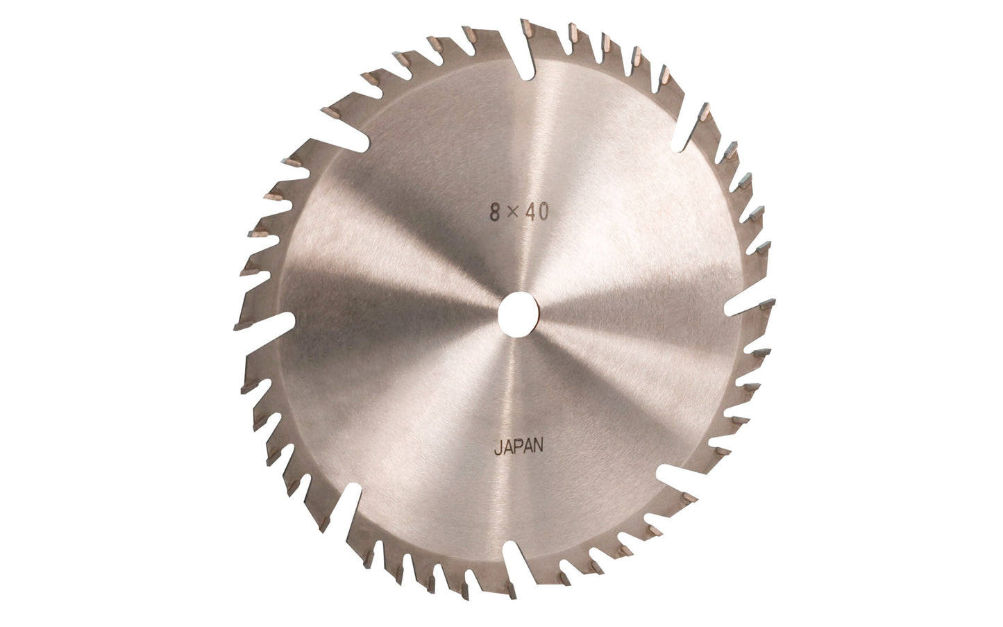 Japanese 8" circular saw blade with carbide teeth made by Sanwa. 40 tooth saw blade for woodworking. Grind: Four Teeth & Raker Style. 0.12" kerf. Sanwa model SF 0840. Made in Japan. -