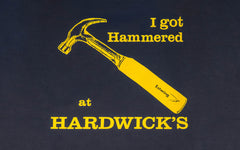 The classic & iconic "I Got Hammered at Hardwick's" hooded sweatshirt. This medium-weight cozy sweatshirt is made of 50/50 cotton/poly fleece & has an attractive navy blue color with a deep yellow lettering print. A customer favorite!