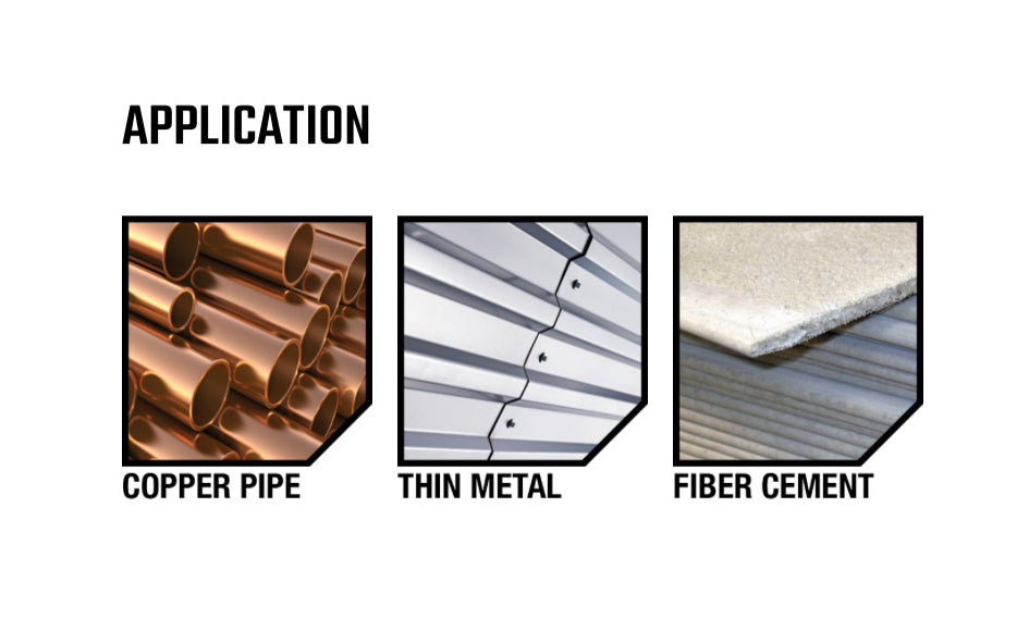 • Recommended applications: Metal (1/8" to 5/16"), Copper Pipe, Thin Metal, Fiber Cement
