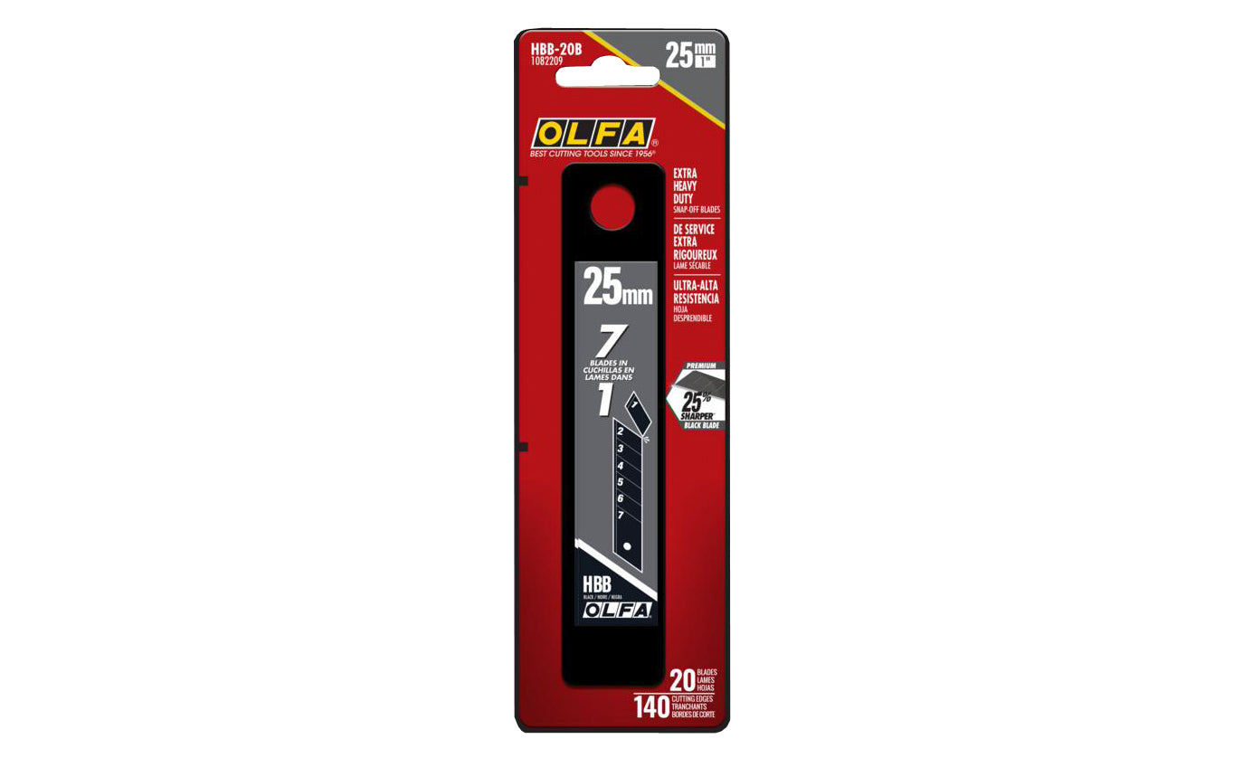 These Olfa 25 mm Replacement Blades have an exceptional razor-sharp edge. Premium black blade Japanese carbon tool steel coupled in a double-honed blade provide 25% more sharpness than silver OLFA blades. The 1" blade provides more leverage on extra heavy-duty substrates. Each blade come with seven segments. The segments are notched deep and straight to provide a clean snap. When a section is dull, simply snap for a new, ultra-sharp edge. OLFA Black Snap Blades are exceptionally sharp and durable for a variety of applications. Sold as 20 PK of blades. Fits most Olfa 25 mm heavy duty snap-off utility knives. Made in Japan.From the Manufacturer - About OLFA: