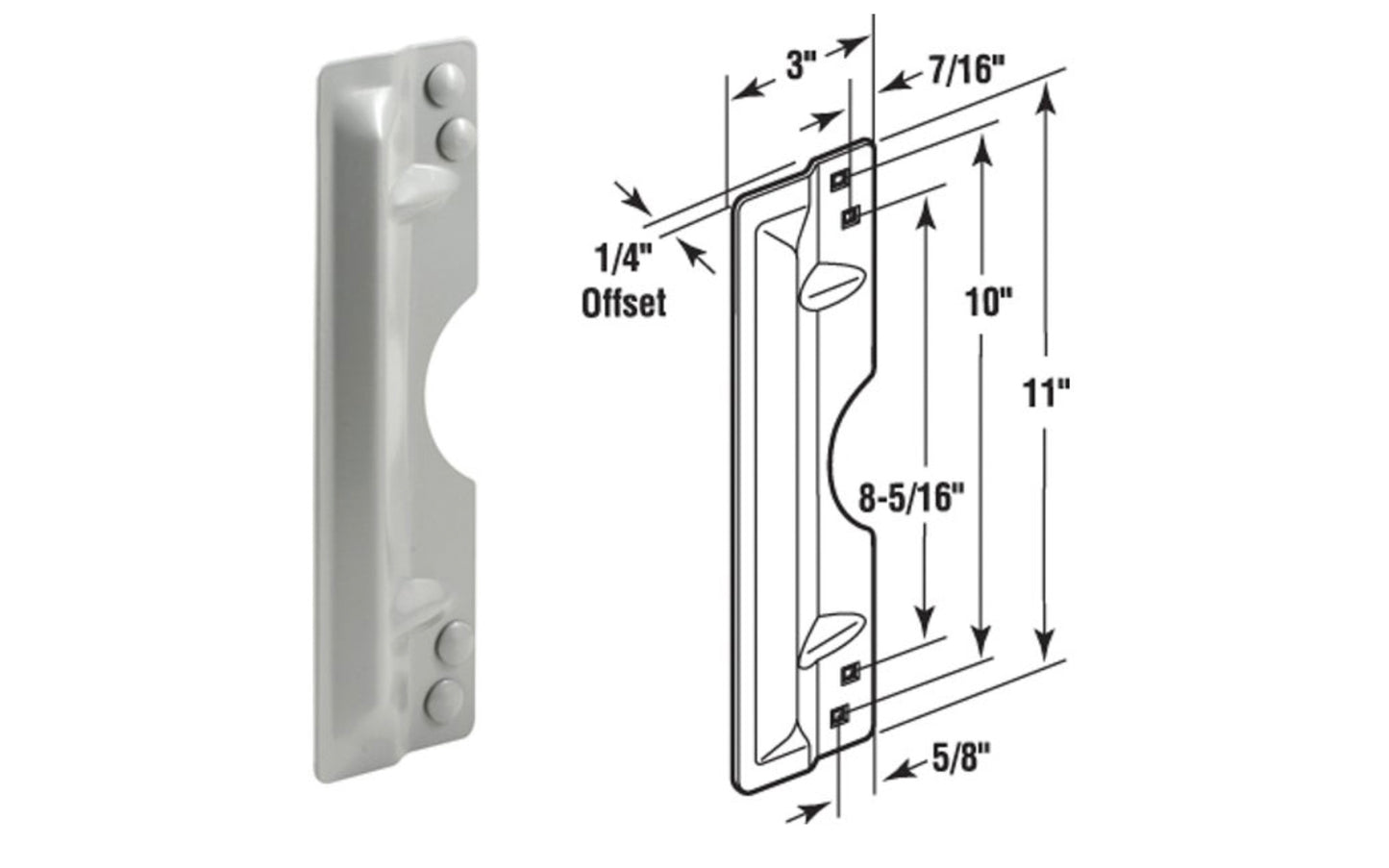 • 11" Gray Finish Latch Shield. Protects latch or bolt. Covers the latch bolt area of door and lock assembly. Ideal for use with mortise or cylindrical lock. Heavy-duty 12-gauge steel. Frame pin to help prevent the separation of the door and frame by the use of a pry bar. Nonhanded. Easy 3-hole installation. Steel cadmium-plate. US2C.  Prime-Line Model U 9503.