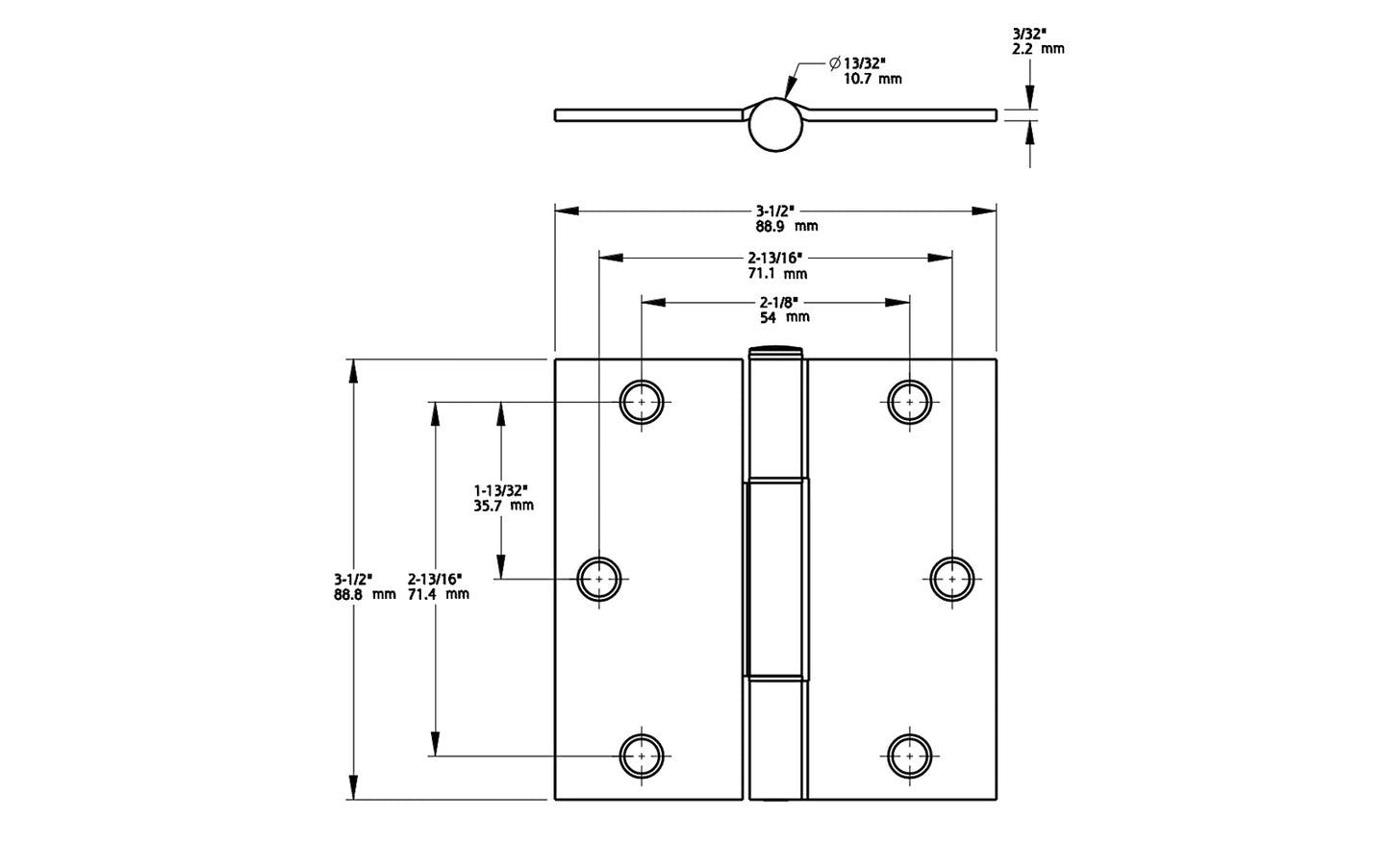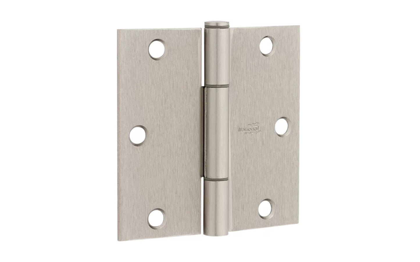 These "Squeak-Guard" hinges enable doors to pivot on one edge as they silently open & close. Surface-mounted application for easy DIY installation. 50 lb. safe working load per hinge. Very durable bearing with 5x strength of steel for high-quality performance. Satin Nickel finish on steel material. Countersunk holes. Includes flat head screws. 3-1/2" x 3-1/2" square corner door hinge. Removable pins. Instructions & mounting hardware included for installation. 3 Pack of hinges. National Hardware Model No. N830-448. -