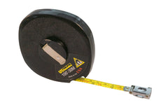 Contractor Series Long Measuring Tapes feature a closed reel design with a hand rewind crank that folds into the hub. The case is made of tough ABS plastic. US Tape Model 58655. Made in USA. -
