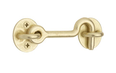 4" Brushed Gold (Brushed Brass) Privacy Hook. Designed for interior barn door hardware. Adds a privacy function to any sliding door hardware door. Includes fasteners. Sold as a single hook and pad. Includes four flat head phillips screws. National Hardware model N700-154. -