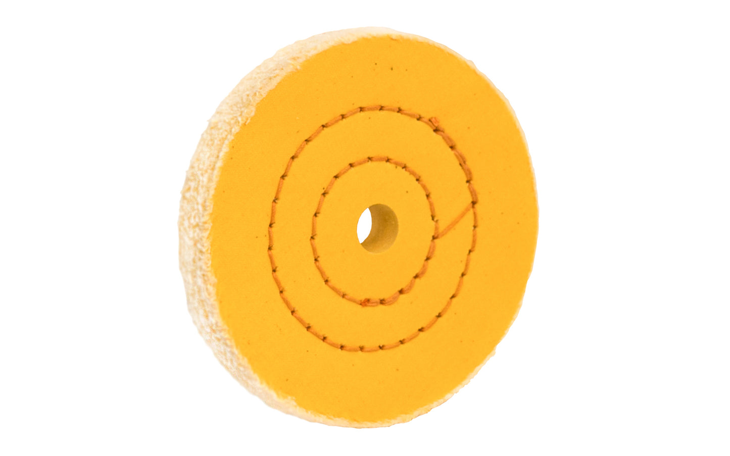 A quality USA-made treated yellow 4" buffing wheel made by Dico Polishing. These yellow mill treated buffs perform more aggressively than regular cotton cloth. Use on all metals with the appropriate compound where a faster cut is needed. Note: No washers included. Made in the USA.From the Manufacturer: