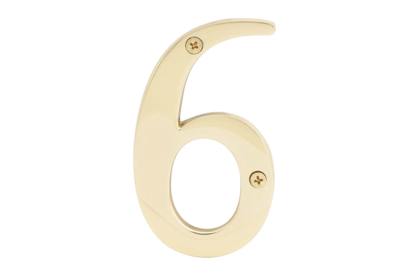 Number Six Solid Brass House Number in a 4" Size. Made of solid brass material - 1/4" thickness. Lacquered brass finish. Includes two flat head phillips screws. #6 House Number. Hy-Ko Model No. BR-90/6. -
