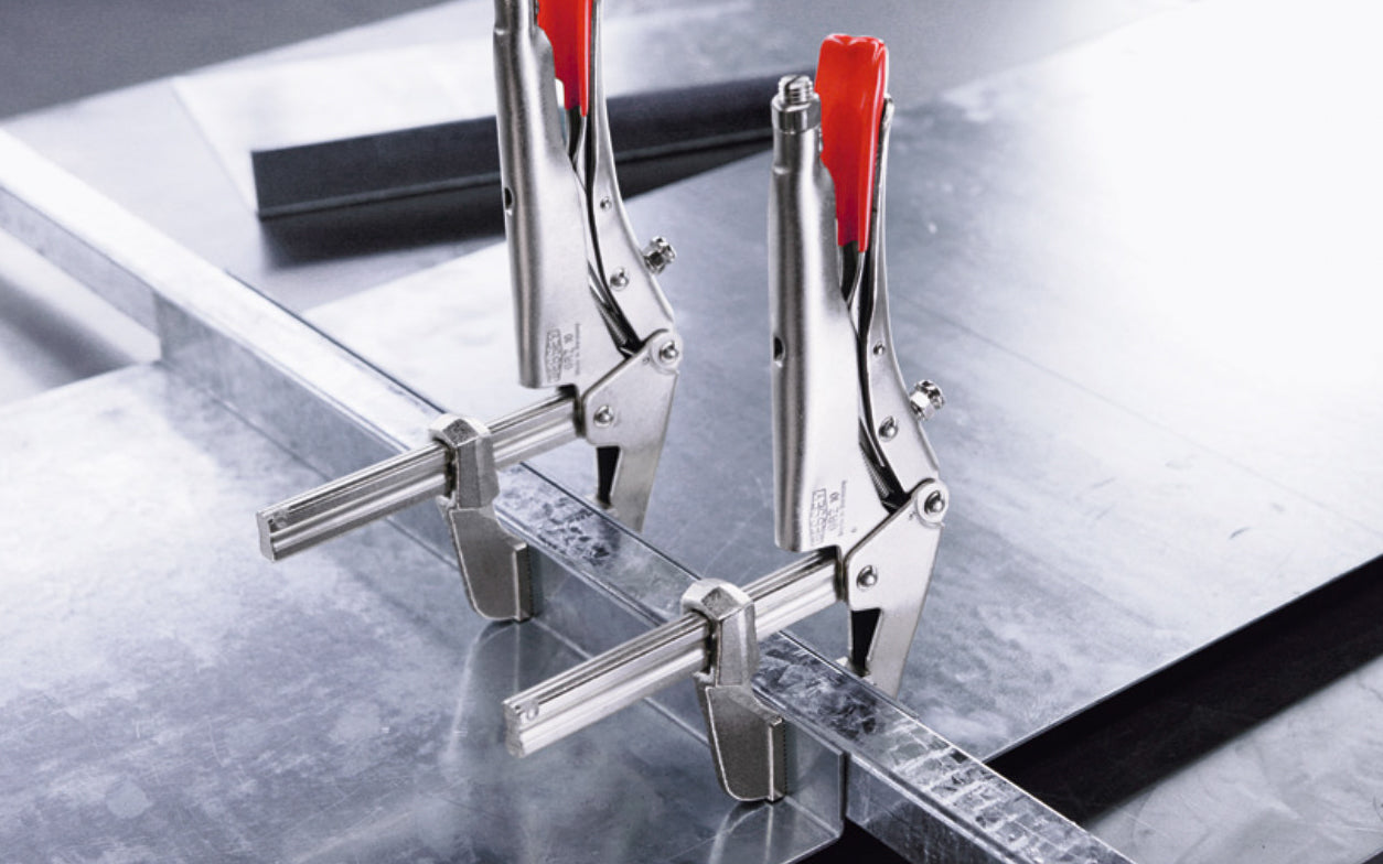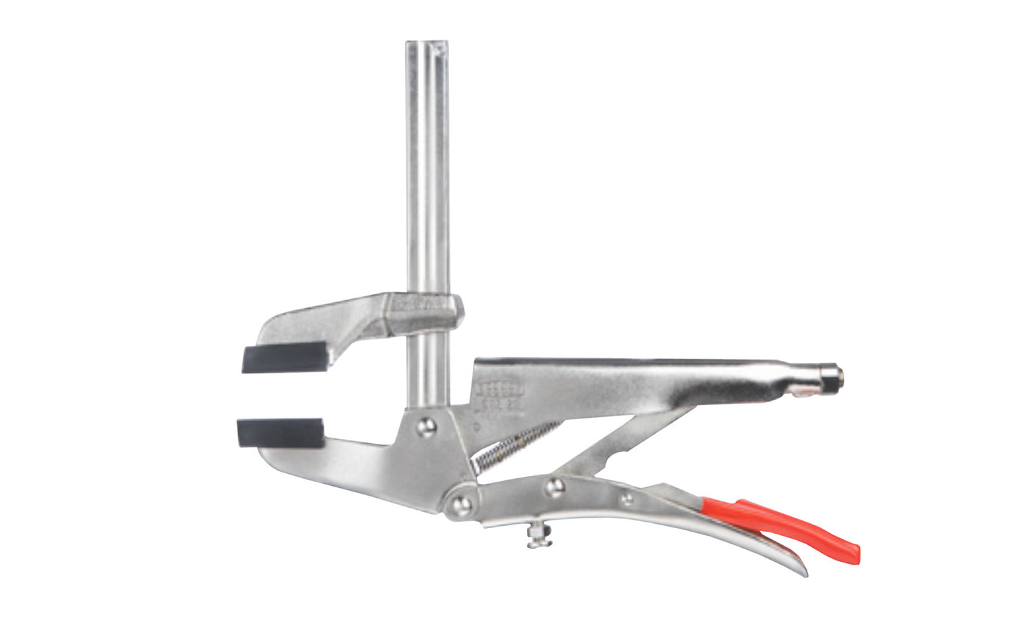 This Bessey 4" "SuperGrips" Grip Plier Clamp with Profiled Rail is a special grip plier & clamp all in one tool. It has an adjustable sliding jaw with a 4" clamping capacity & 2-1/2" throat depth. Adjustable screw/lock nut (on lower lever) adjusts jaw angle (up to 7°) for clamping tapered parts, & an adjustable screw/lock nut (on top handle) adjusts clamping force. 440 lbs. clamping force. Made in Germany.From the Manufacturer - About Bessey