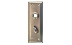 • A classic & handsome door escutcheon plate with a solid brass crescent thumbturn. Made of quality stamped brass material, this escutcheon plate is a well-made & durable piece of hardware. The plate may be used on modern doors with 2-1/8" pre-bored holes, or with the old-style mortise lock sets on traditional doors as well. The thumb turn will enable you to bolt your doors with your old-style mortise locks. Beautify & grace your doors & doorknobs with these most elegant plates!
