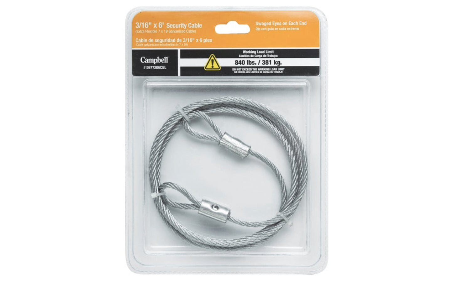 Campbell 3/16" x 6' Galvanized Security Cable with Two Swaged Eyes. Galvanized steel security cable. Swaged eye one end. 840-pound working load limit. 3/16-inch thick. -