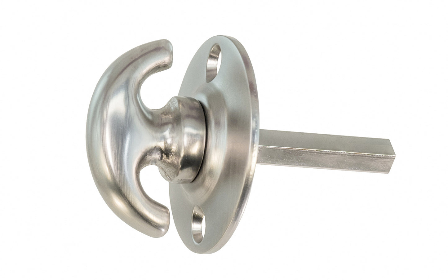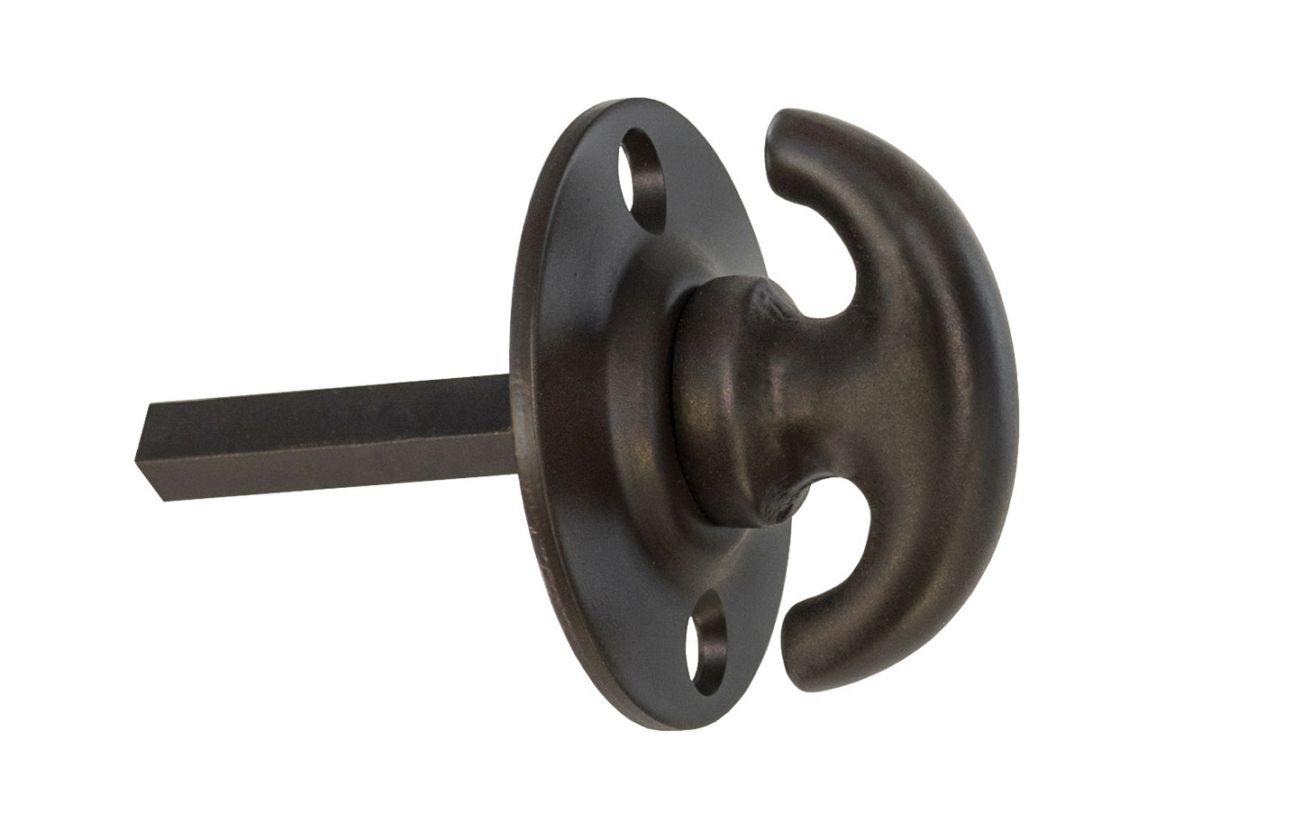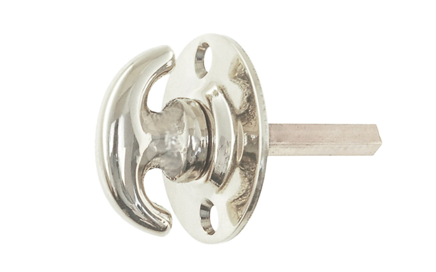 • An old-style crescent thumbturn for locking doors with a round plate. Commonly used with mortise locks, deadbolts, night-locks, catches & similar. The crescent turn & round thick rosette plate are made of solid brass material, making it attractive & durable. 3/16" square shaft spindle size & 1-1/4" long (can be shortened if needed). Available in unlacquered brass (will patina naturally), lacquered brass, oil rubbed bronze, brushed nickel, & polished nickel finishes.  *Note The shaft is attached to the thumb turn piece.