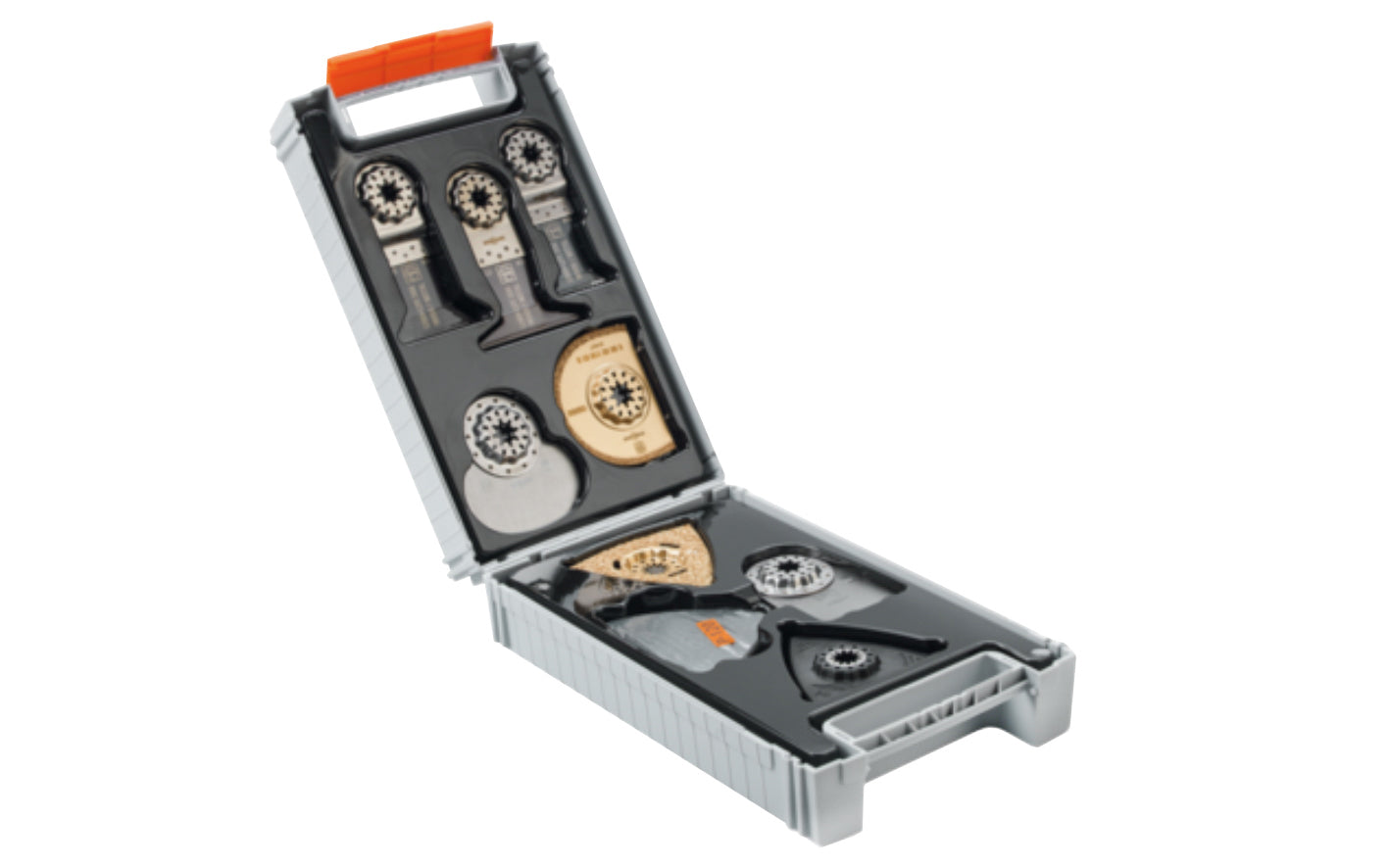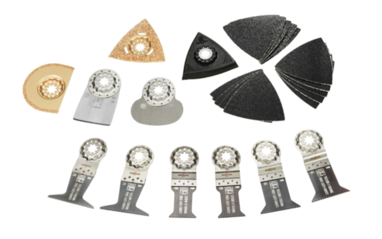 Fein Tools "Best of Renovation" 26-piece accessory set for all your renovation work. Suitable for all Fein MultiTools & all other commercially available multi-tools with the Starlock mount. Includes a practical plastic storage box. Contents: (6) ea. E-Cut Long-Life saw blades, (1) carbide rasp, (1) 3" diameter carbide segment saw blade, (1) rigid scraper, (1) mushroom-shaped cutter blade, (1) unperforated sanding pad, 15 sanding sheets (5 each of grits 60, 80, 120). 26 pieces in kit. Made in Germany.