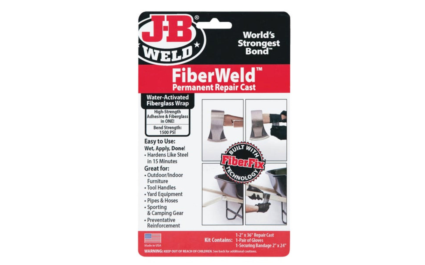 FiberFix combines industrial strength fiber and specialized resin into a wrap that will bond to almost anything, hardens like steel, and provides a permanent fix. Water-activated fiberglass wrap that contains a high-strength adhesive and fiberglass in one. Easy to Use: Wet, Apply and Done! Hardens like steel in 15 minutes. Great for indoor/outdoor furniture, tool handles, yard equipment, pipes and hoses, sporting and camping gear and much more. Great for preventative reinforcment. Kit contains (1) 2" x 36" Repair Cast, (1) Pair of Gloves, (1) Securing Bandage. Built with FiberFix Technology. J-B Weld. Made in USA. -