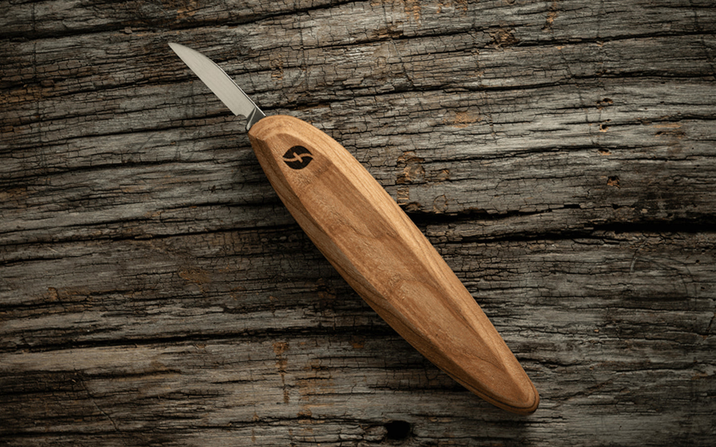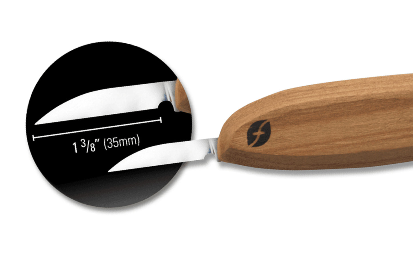 This 1-3/8" Flexcut Pro Detail Knife features a narrowly tapered full flat grind wharncliffe blade in precision heat treated 1095 steel, polished to a brilliant mirror finish. This knife excels at precise detail carving work. The shorter blade length, slim profile, & narrower detail tip provides the highest level of precision & control. 1-3/8" (35 mm) blade length. Flexcut Pro Series. Made in USA. -