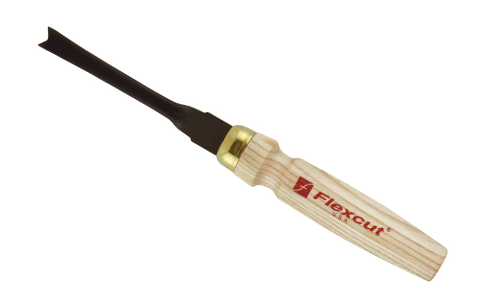 This Flexcut mallet parting V tool can be used by hand or can be struck with a mallet & will suit the needs of advanced & beginning carvers. The V-tool is great for carving hardwoods & other large dense projects. The blade is made of High Carbon Steel. The cutting edge is hand honed & polished. 60 degrees V-Tool. Made in the USA. -