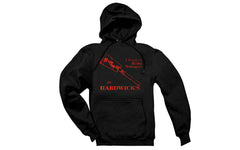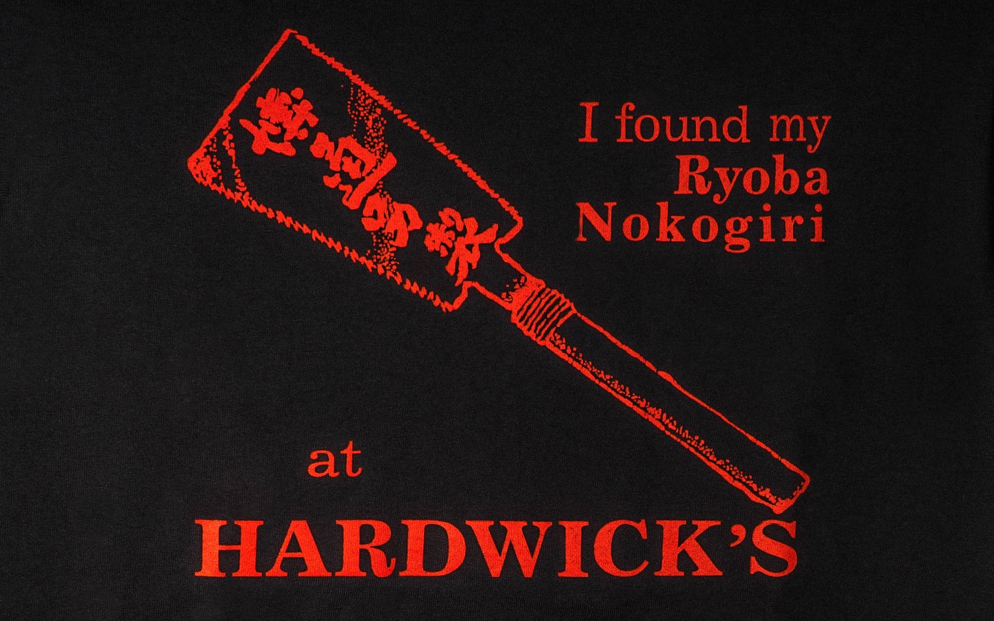 The ever popular "I Found My Ryoba Nokogiri at Hardwick's" hooded sweatshirt. This medium-weight cozy sweatshirt is made of 50/50 cotton/poly fleece & has a good looking black color with a fiery red lettering print. A very popular sweatshirt & a great conversation starter! -