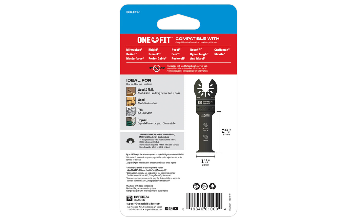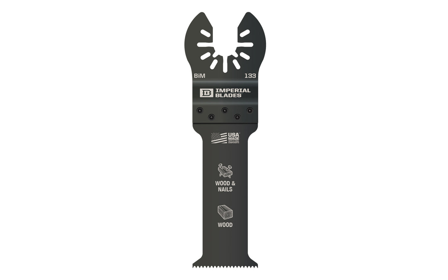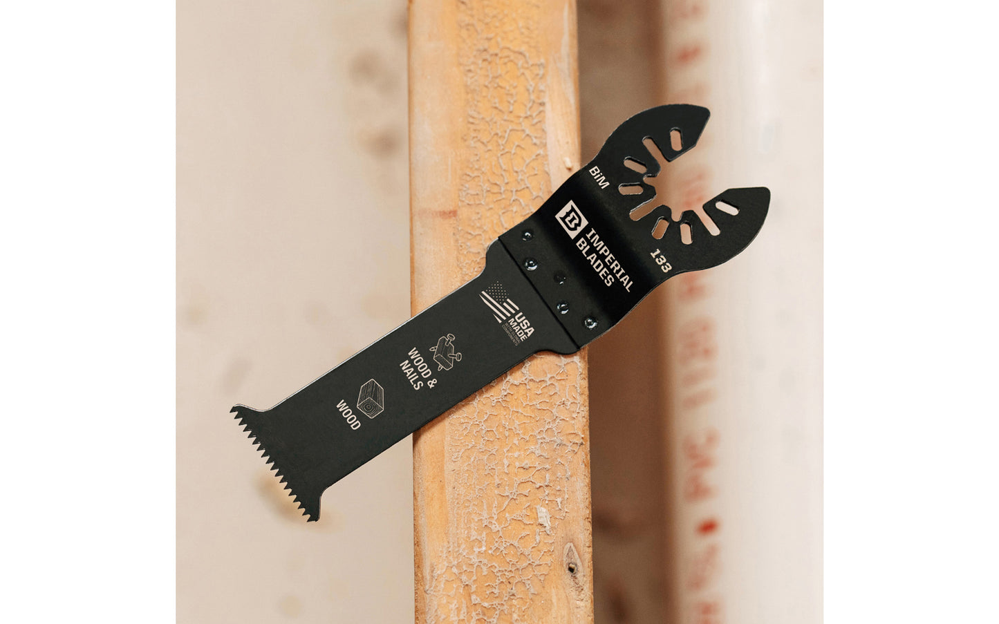 •  Imperial Blades "One Fit" 1-1/4" Extended Plunge Thick Wood Blade is a Bimetal blade with a long, thin blade specifically designed for cutting in hard-to-reach areas. Recommended applications: Wood & Nails, Wood, PVC. Up to 15X longer life than standard Imperial high carbon steel blades. Popular projects: Cutting under the kick plate when installing new kitchen flooring, undercutting door jambs & flush cutting tongue-and-groove.     Made in USA.