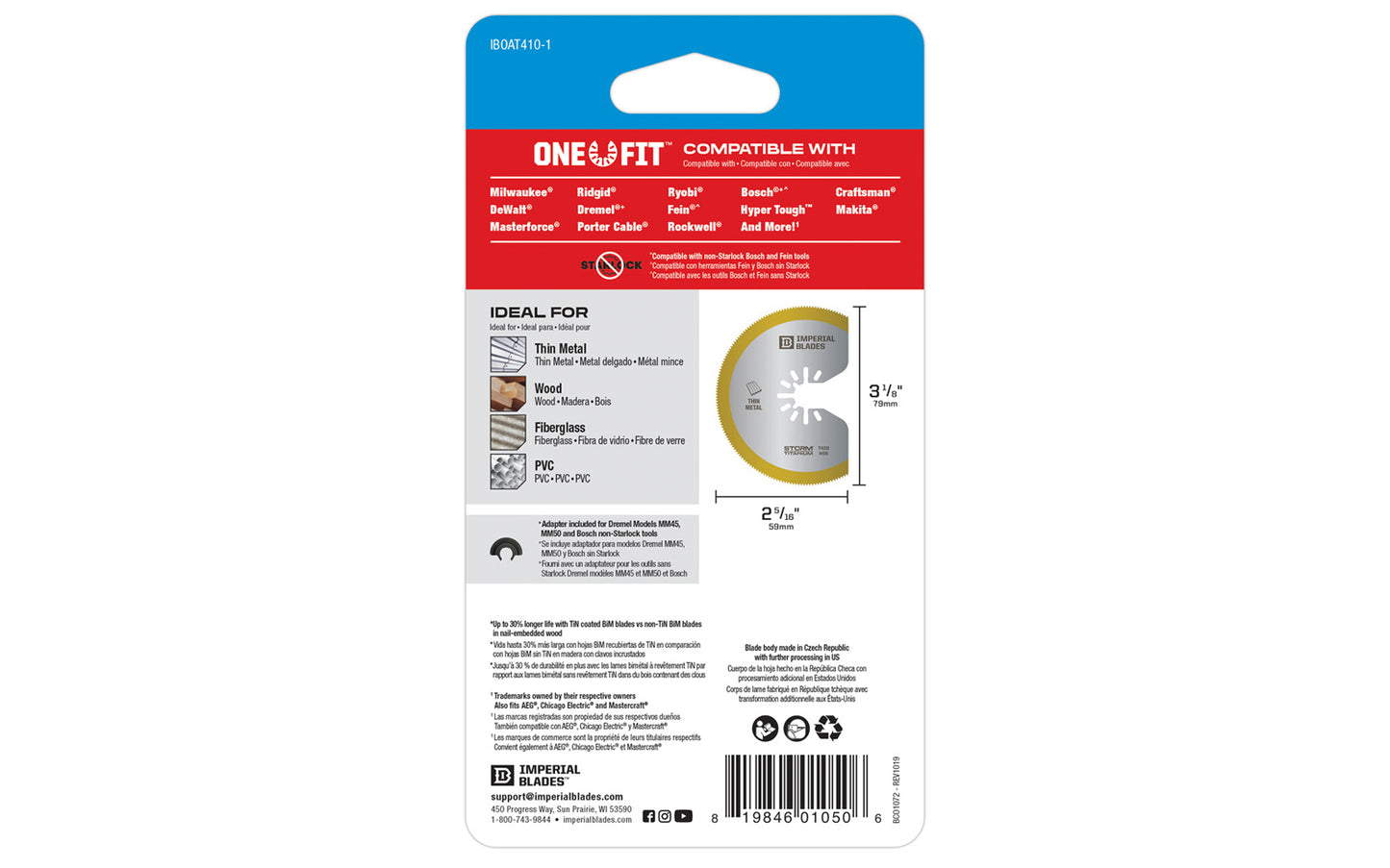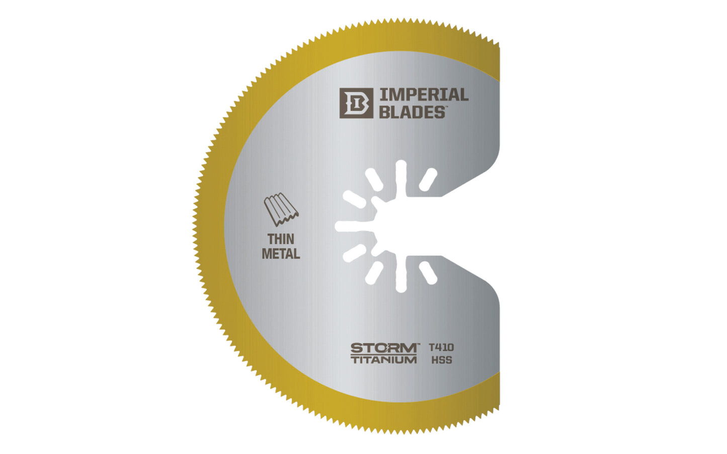 Imperial Blades "One Fit" 3-1/8" Storm Titanium Thin Metal Segment Blade is a Storm Titanium Enhanced (TiN) coated blade for longest life & best performance. Segment blade shape ideal for working in corners & on edges without overcut. Recommended applications: Thin Metal, Wood, Fiberglass, PVC. Popular projects: Long, straight cuts in sheet or thin metal for ductwork. Made in USA.