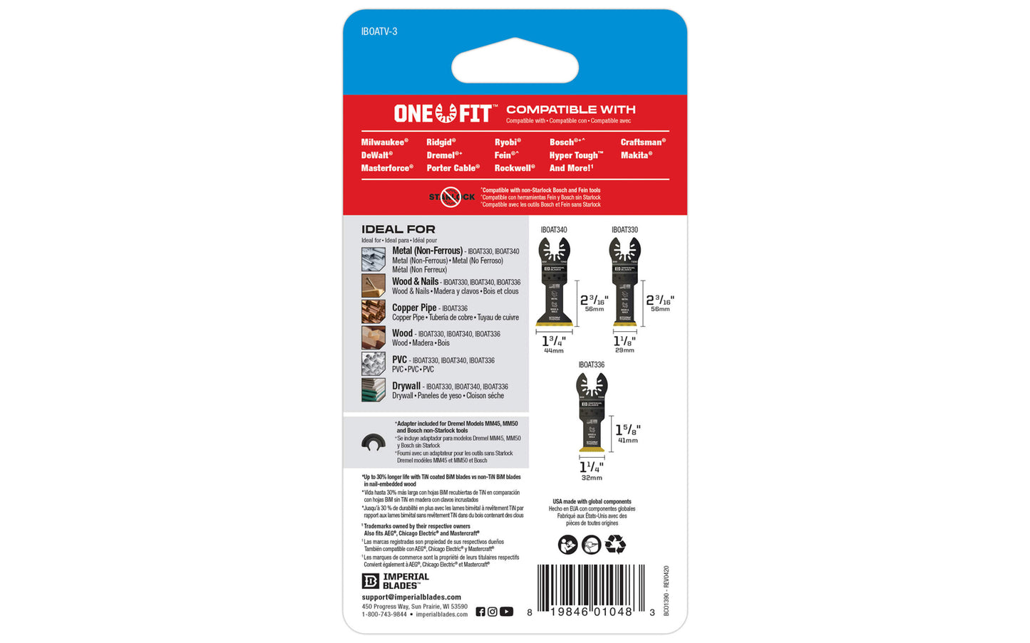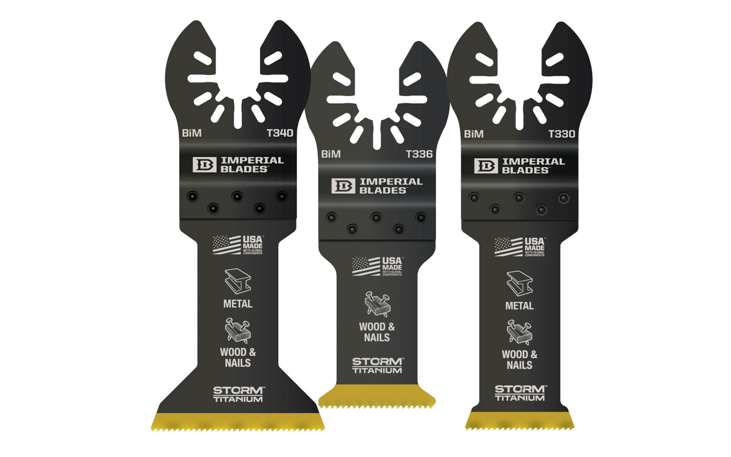Imperial Blades "One Fit" Storm Titanium Metal/Wood Variety Pack - 3 PC. Variety pack of Storm Titanium Enhanced (TiN) coated blades for longest life, best performance. Recommended applications: Metal (Non-Ferrous), Wood & Nails, Copper Pipe, Wood, PVC, Drywall. 3 blades in pack. Made in USA.