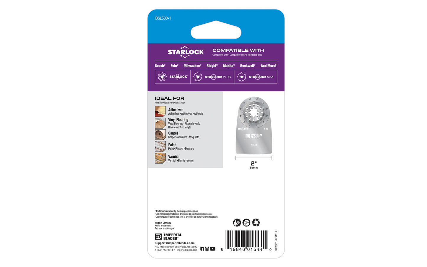 Imperial Blades "Starlock" 2" Hard Material Rigid Scraper. Recommended applications: Adhesives, Vinyl Flooring, Carpet, Paint, Varnish. Popular projects: Removing caulk or vinyl floors in bathroom or home renovation & removing urethane or adhesive residues in car restoration. Made in USA.