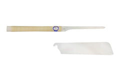 This Japanese Z-Saw is a good semi-fine woodworking saw for the finish carpenter, cabinet maker, & or furniture maker. The saw works well for medium to fine cutting jointery, & produces good clean & smooth cuts. With a starting "beak" tooth, this saw allows you to start a cut in the middle of a wood panel. The saw features a metal spine back which gives the saw very accurate straight cuts. The teeth are impulse hardened which makes the blade tough & durable for prolonged life & wear. The blade also can be removed when/if needed to be replaced. See replacement blade here. The handle is made of wood, wrapped in traditional Rattan for a comfortable grip. Made in Japan.About Japanese Pull Saws