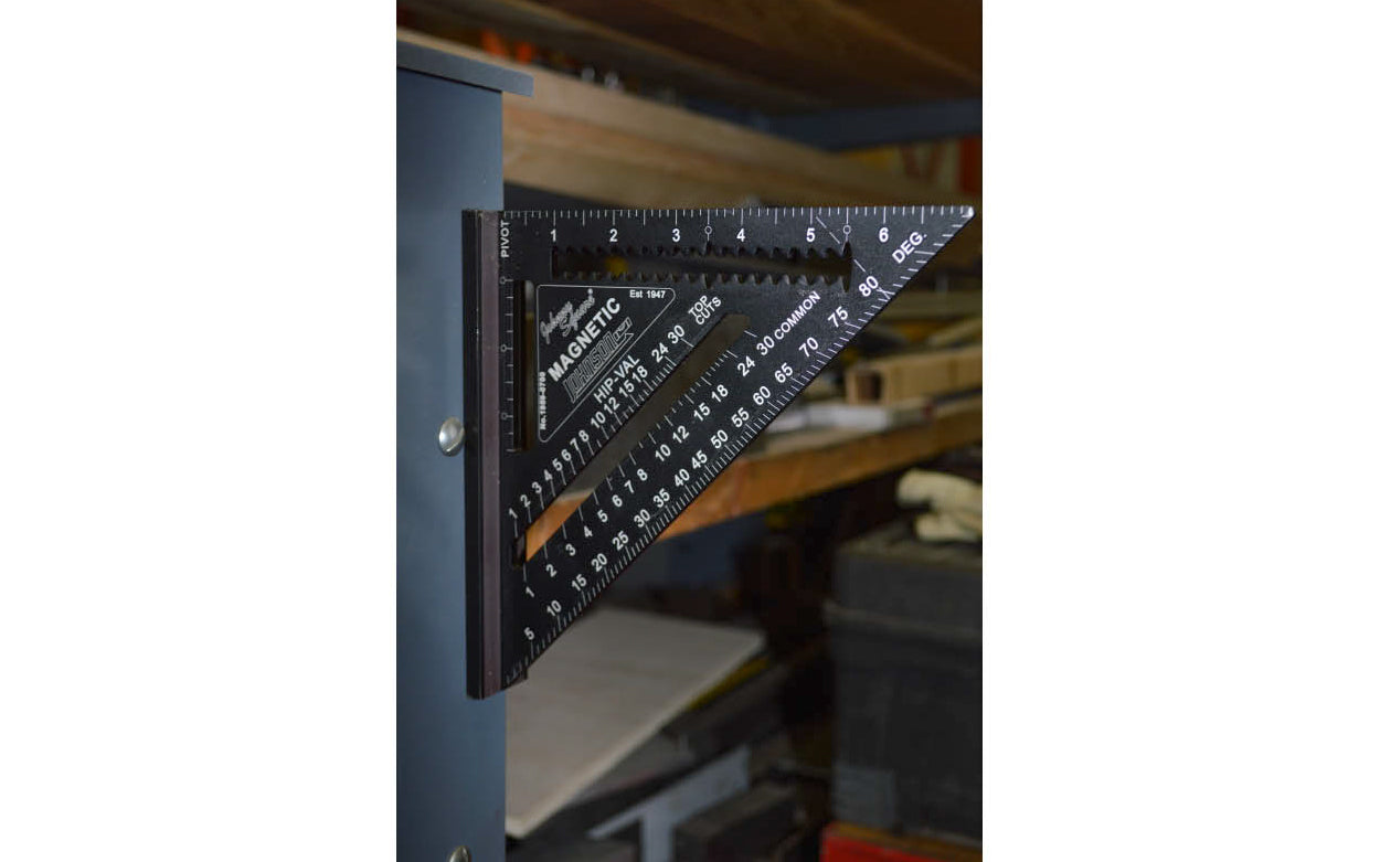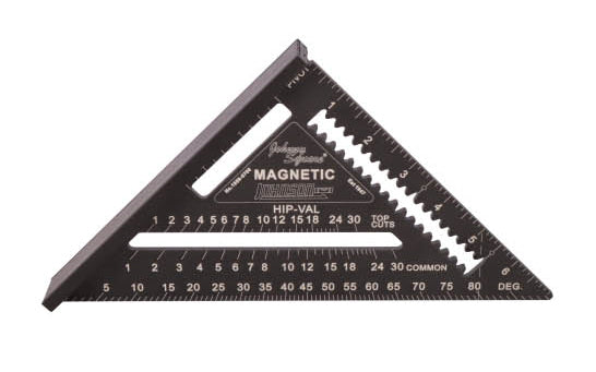 To develop one of the world's best rafter squares, Johnson first had to engineer the "EZ-Read" finish, its revolutionary anti-glare protective coating that diffracts sunlight rather than reflecting it, so it looks as crisp in full sun as it does in the shade. The "EZ-Read" finish also increases friction to better secure your square against your lumber when using it as a saw guide. The magnetic "Johnny Square" is highly durable & accurate. Its solid aluminum body construction with CNC machined edges ensure an accurate reading every time. This rafter square also features continuous scribing notches that are ideal for ripping at 3-1/2" & 5-1/2" as well as handy markers that measure 2x4 board dimensions of 1-1/2", 3" & 3-1/2". Strong magnets for hands-free use. -