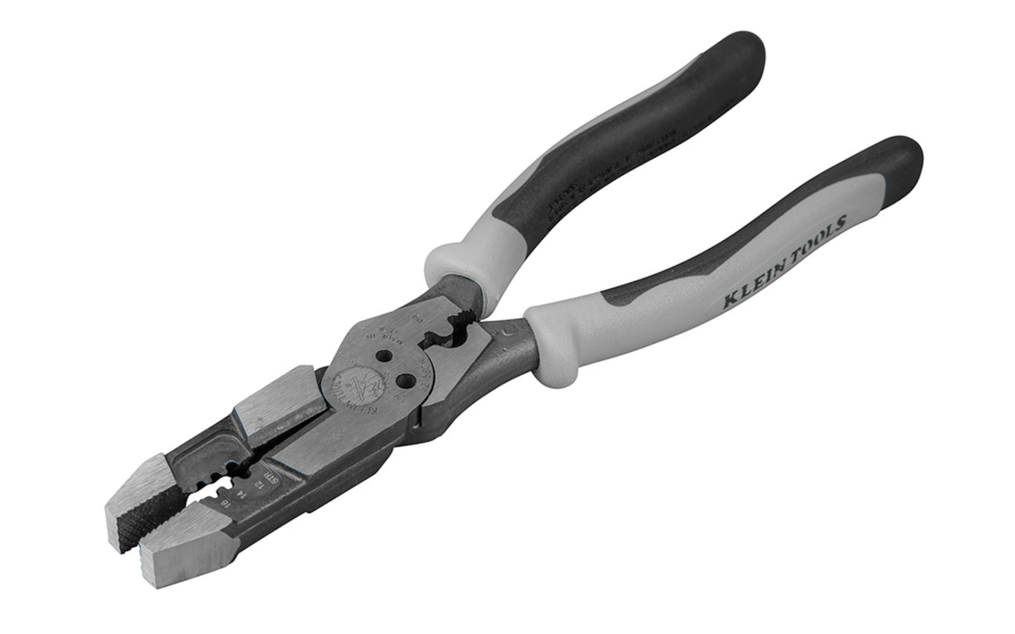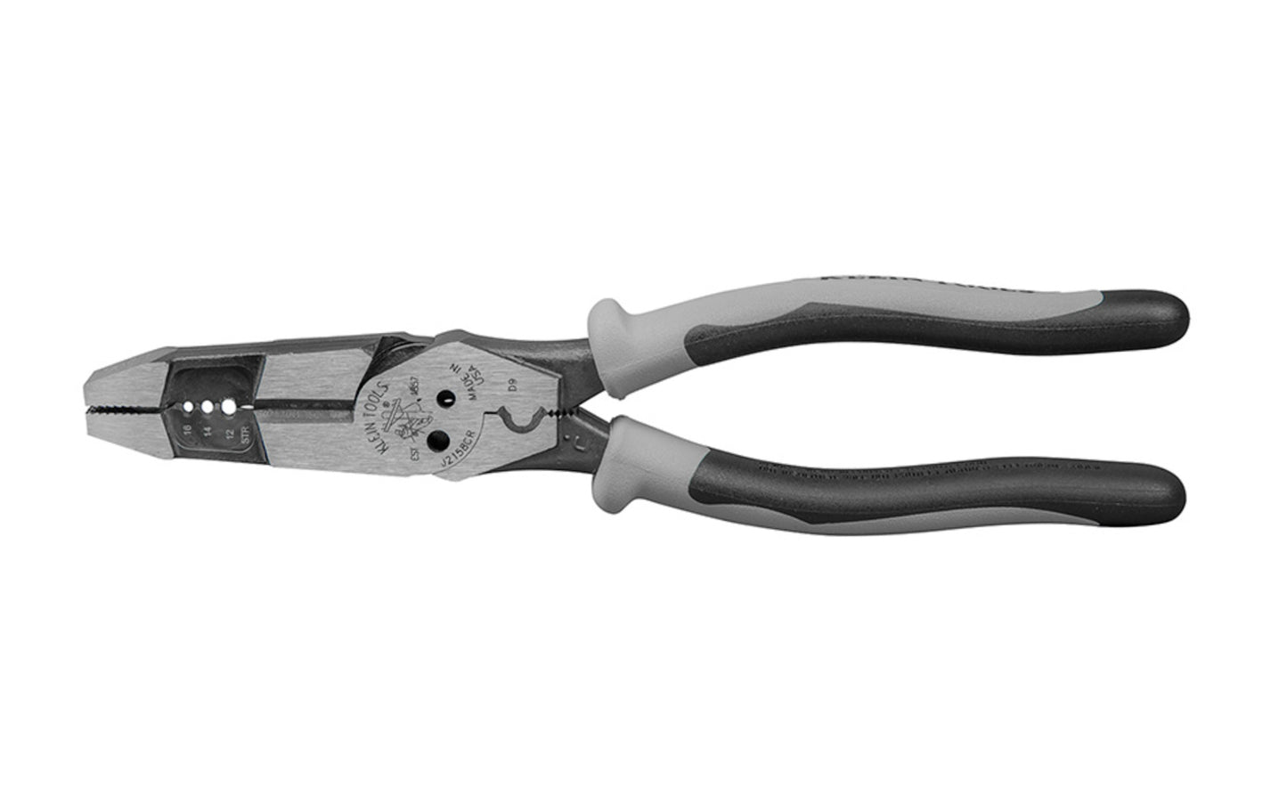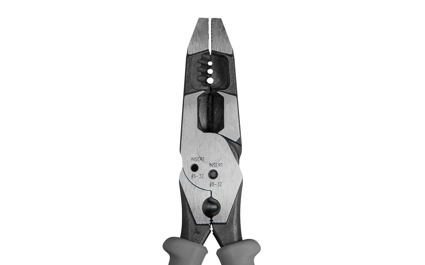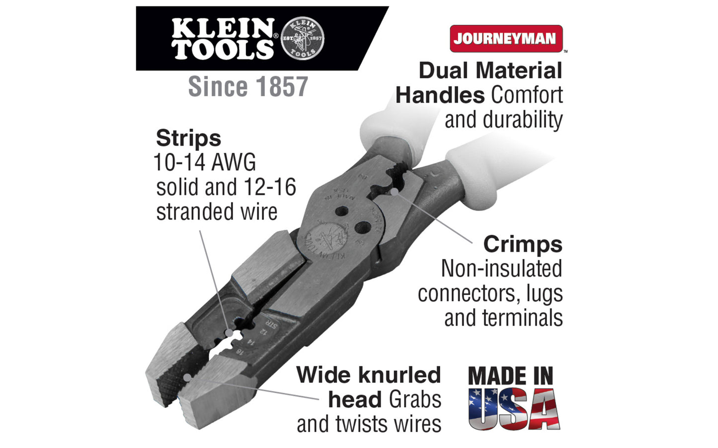 The Klein Tools Hybrid Pliers with Crimper & Wire Stripper can strip, cut, twist, shear & crimp all in the same tool. With full length, induction hardened knives & a high-leverage design, these hybrid pliers provide more cutting power on hard wire. It easily strips 10-14 AWG solid & 12-16 stranded wire. The wide, knurled head easily grabs & twists wires. Convenient holes for shearing 6-32 & 8-32 bolts plus a crimper for non-insulated connectors, lugs & terminals make this a must-have tool for your bag. Made in USA. -
