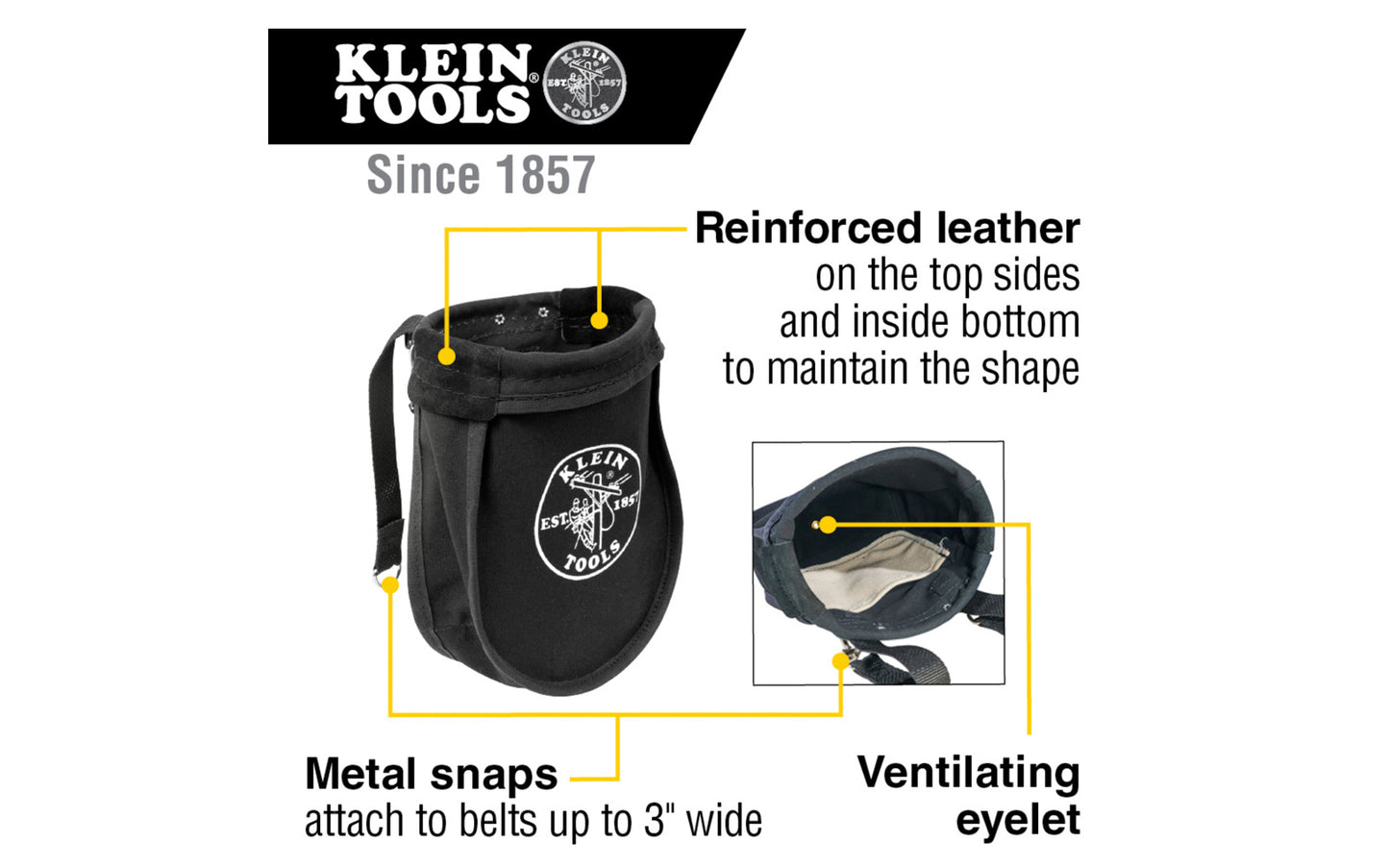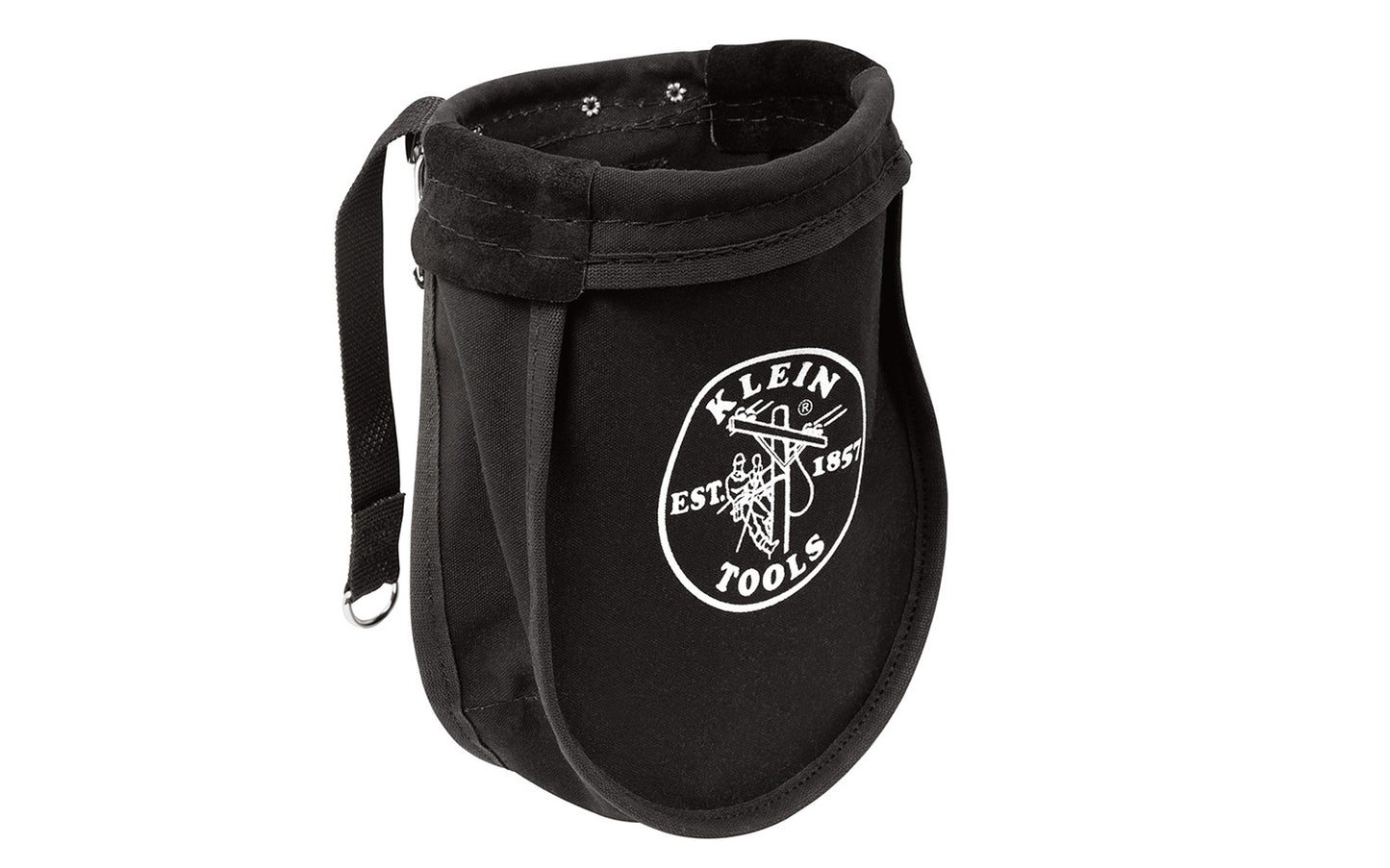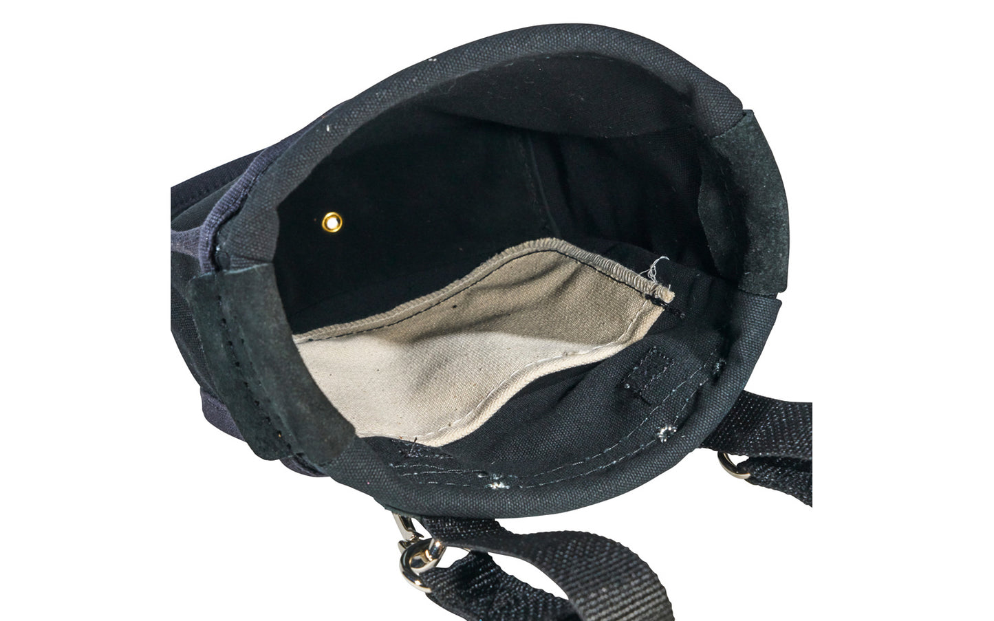 Klein Tools' Nut & Bolt Pouch is reinforced with leather & rope, which also keeps the shape of the pouch opening. This tool bag has an interior pocket, & metal snaps on the loops for belts up to 3" wide. Overall size measures 9" x 3.5" x 10". Made in USA. -