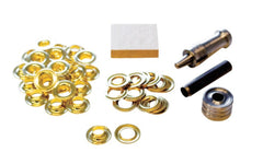 • 3/8" Brass Grommet Kit, complete with tool & brass grommets for replacement or repairs in canvas or plastic. Instructions included. Tools with kit: Cutting block, hole cutter, inserting punch & die. Great for vinyl & canvas, tents, sails, covers for boats, trailers, pools, flags & banners, etc. 3/8" inside diameter grommets. Made by Lord and Hodge, Inc.  Made in USA.