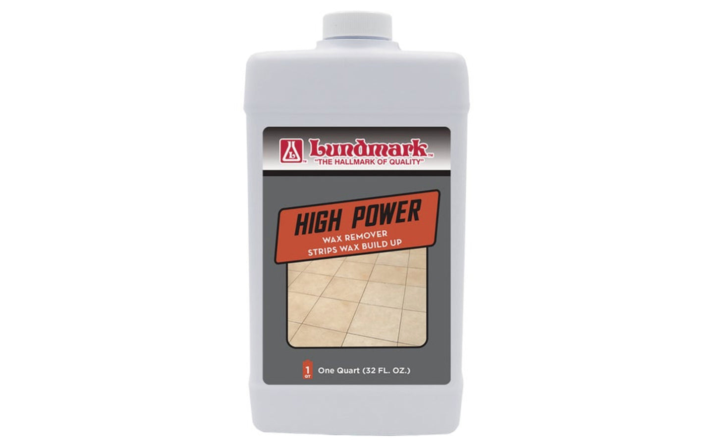 Lundmark 32 oz High Power Wax Remover. 1 quart of this heavy-duty concentrated wax remover makes 16 quart of stripper that removes wax without scrubbing. Simply apply then rinse. High power wax remover is not to be used on wood floors. Paste wax should be removed with paste wax remover. Lundmark Model 3204F32-6. Made in USA. -