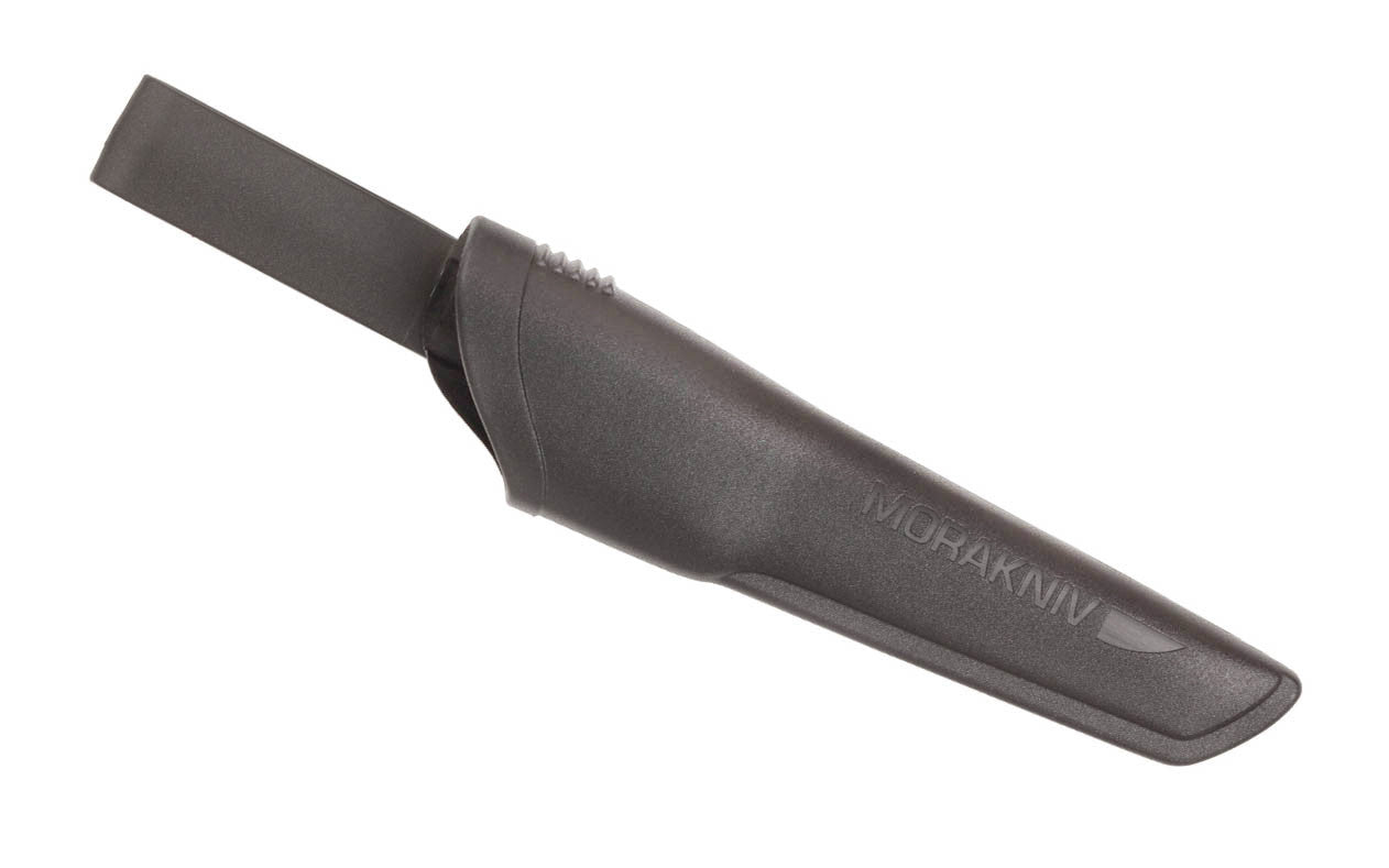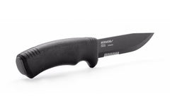 The extra hefty Bushcraft Black stainless knife with special serrations on the blade! This knife is fantastic for heavy-duty outdoor pursuits & marine environments! It is one of Mora of Sweden's sturdiest knives made! The knife is made of high quality Swedish Sandvik Stainless Steel with a special tungsten black coating that additionally helps against corrosion! The back of the blade can also be used with a fire starter since the back edge of the blade is sharp & ground for that exact purpose. The blade has a blunter edge angle of 27° for maximum sharpness retention as well. The fixed blade extends down through the handle for a durable & well made knife. The blade has a perfect balance between length & width, which gives it a better experience when using it. The handle has an excellent high friction grip & has a small finger guard for safety. A fantastic & heavy-duty blade you will have for years to come!