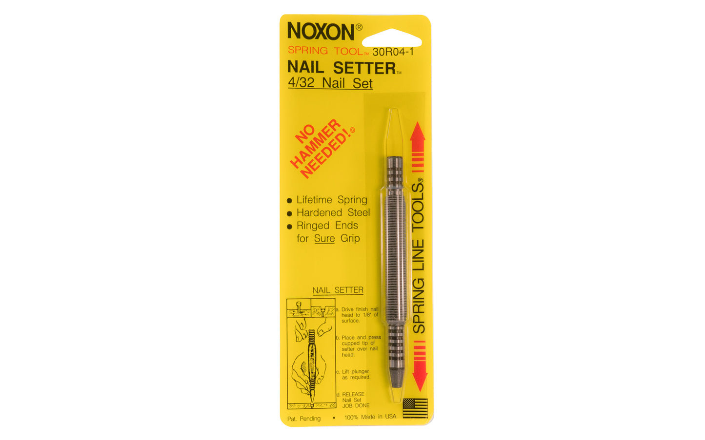 Noxon "Spring Tool" 4/32" Nail Set. This spring tool nail setter is a tool to drive finish nails below the surface of wood. Choose cup diameter which matches nail head. This 4/32" nail setter is best suited for #12 finish nails. No hammer is needed, but you may use one if you wish. Make certain to strike the end squarely with hammer. Made in USA. -