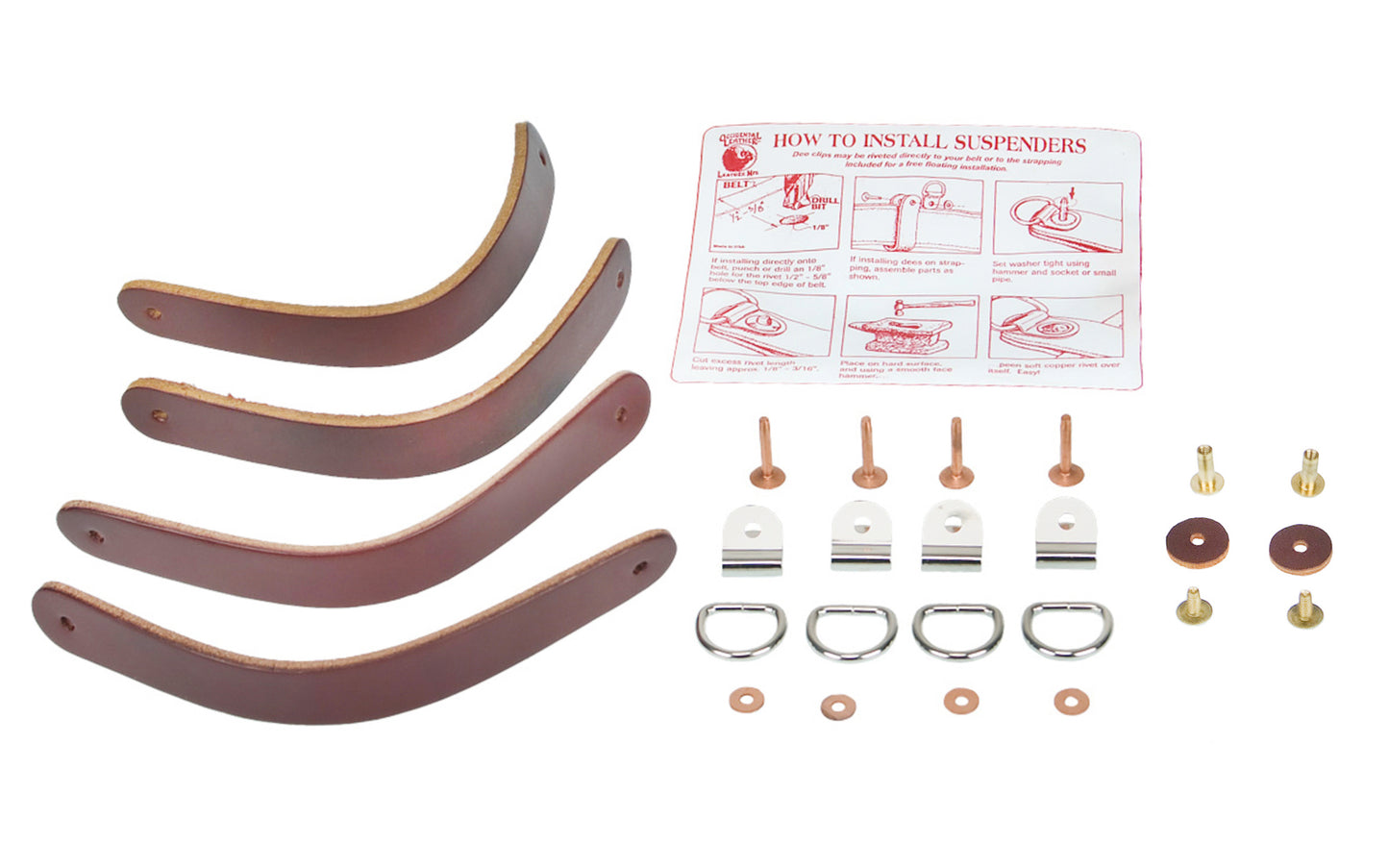 • Suspender attachment kit used to attach Occidental Leather suspenders (5055, 5009 & 1546) directly to your tool belt, or to create your own belt loops. Includes brass screw posts & leather washers.   Made in USA.