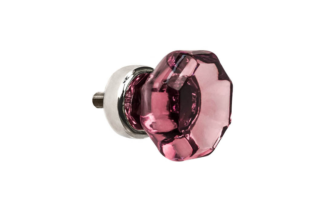 A very elegant & classic octagonal cabinet glass knob with an attractive vintage-style "Purple Amethyst" color. The glass is carefully set into a handsome solid brass base with a threaded shank in the back. It also comes with a 8-32 thread truss head screw which allows for mounting the knob from the back. The solid brass base has a polished nickel finish. This octagon shape cabinet knob is designed in the Late 19th Century / Early 20th Century style of hardware / Arts and Crafts style, but will match any period style up to current modern styles. A beautiful & elegant knob for cabinets & furniture. Available in 1" & 1-1/4" diameter size knobs.