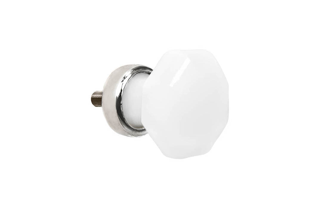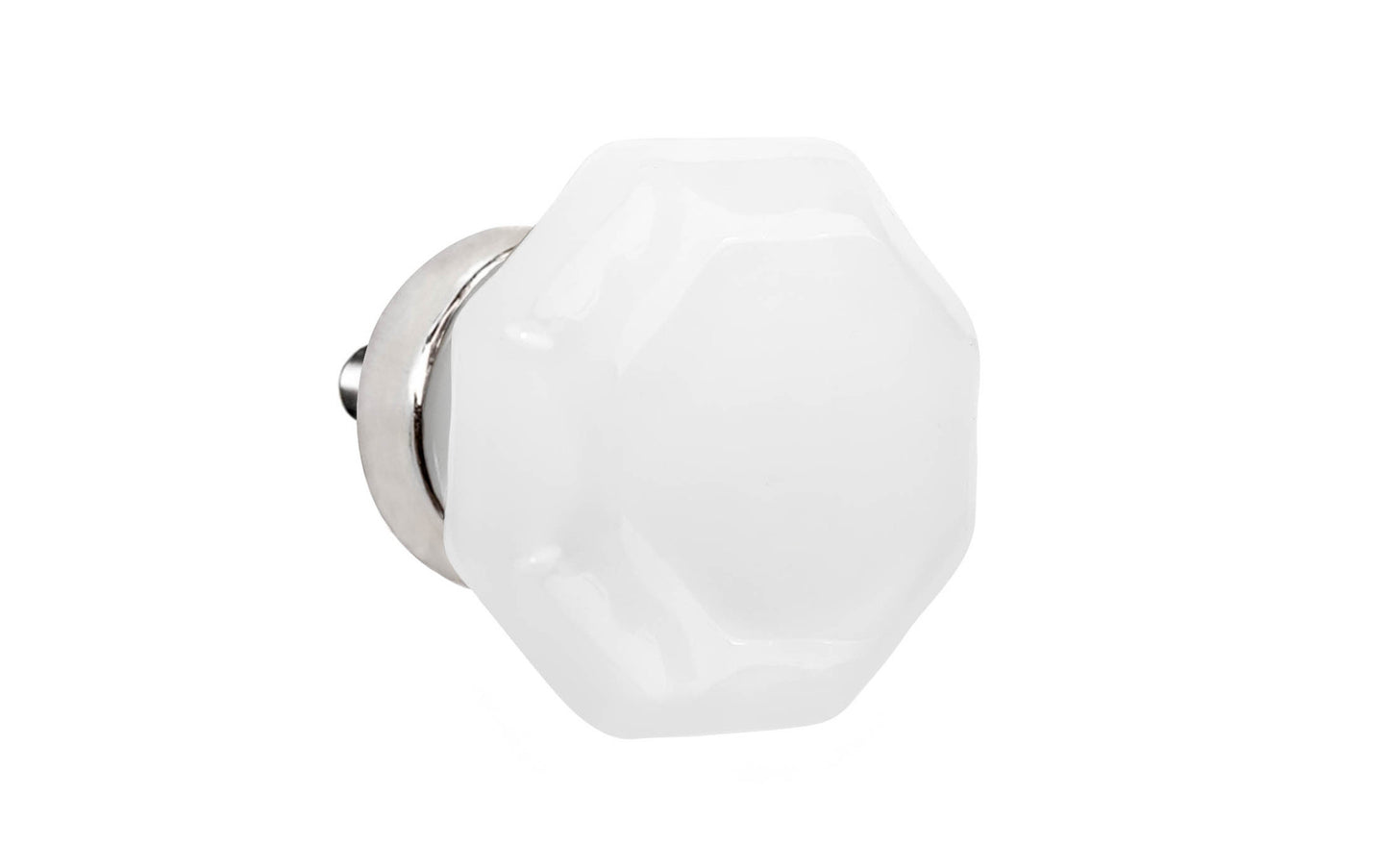 A very elegant & classic octagonal cabinet glass knob with an attractive "Translucent White Opal" / "Milk White" color. The glass is carefully set into a handsome solid brass base with an polished nickel finish, with a threaded shank in the back. It also comes with a 8-32 thread truss head screw which allows for mounting the knob from the back. This octagon shape cabinet knob is designed in the Late 19th Century / Early 20th Century style of hardware / Arts and Crafts style, but will match any period style up to current modern styles. A beautiful & elegant knob for cabinets & furniture. Available in 1", 1-1/4", & 1-1/2" diameter size knobs. For matching glass octagonal pulls See here.
