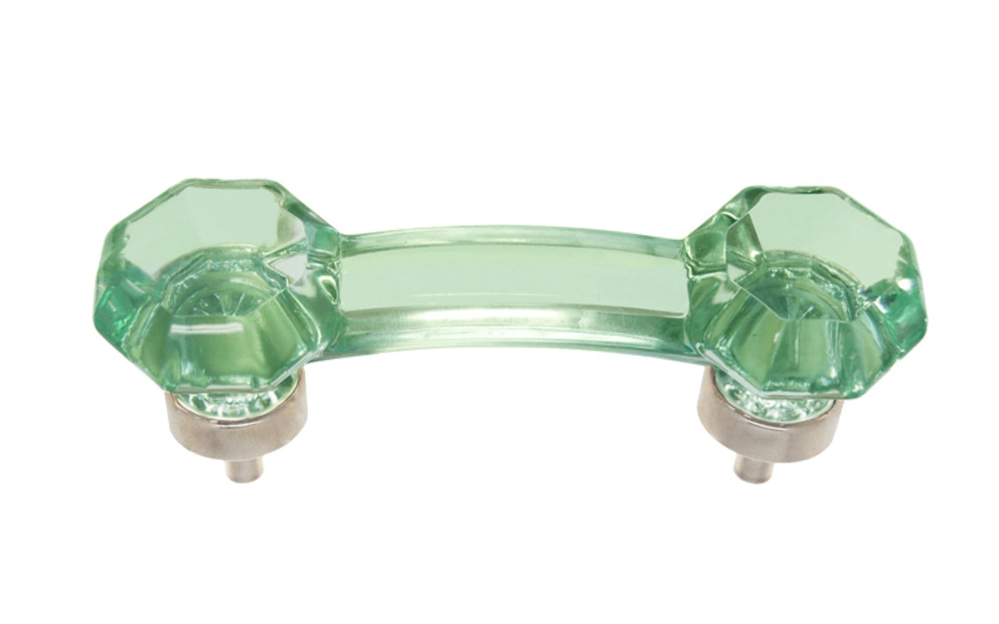 A very elegant & classic octagonal cabinet glass pull with an attractive Vintage-style "Depression Green" color. The pull handle has 3" on centers sizing. The glass is carefully set into solid brass bases with threaded shanks in the back. It also comes with two 8-32 thread truss head screws which allows for mounting the handle pull from the back. The solid brass bases have a brushed nickel finish. This octagon shape bridge handle pull is designed in the Late 19th Century / Early 20th Century style of hardware / Arts and Crafts style, but will match any period style up to current modern styles. 3" center to center holes. A beautiful & elegant handle pull for cabinets & furniture. For matching cabinet knobs See here.