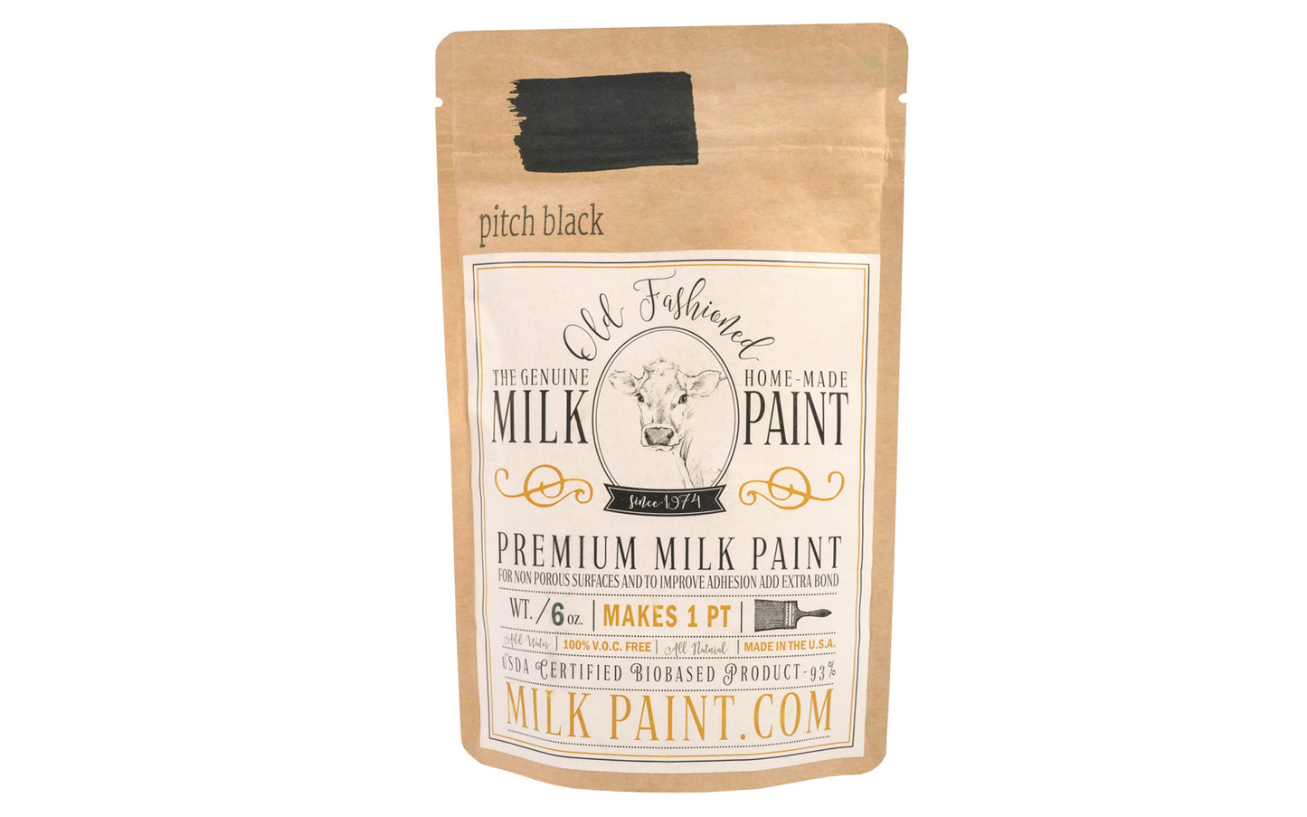 Product Net Weight Bag SKU # Item # Old Fashioned Milk Paint ~ Pitch Black - 2 oz Bag (Covers 12 Sq. ft.) 2 oz MP-PITCHBLACK 2 OZ 113S Old Fashioned Milk Paint ~ Pitch Black - 6 oz Bag (Makes 1 Pint - Covers 36 Sq. ft.) 6 oz (Makes 1 PT) MP-PITCHBLACK 6 OZ 1130