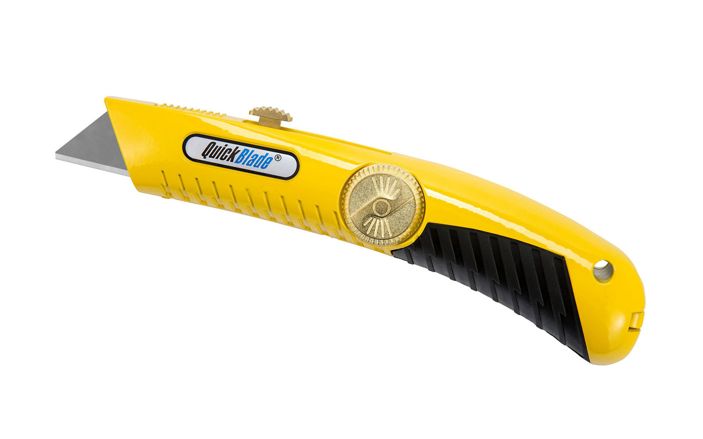• This retractable metal utility knife is a contractor quality knife with a die cast metal body, ergonomic rubber grip & three secure locking blade depths. It's all-metal construction is extremely durable & features a convenient tool free blade change with it's integrated hinge design & easy-open dial. 6-1/2" overall length. "QuickBlade" Knife. PHC - Pacific Handy Cutter.