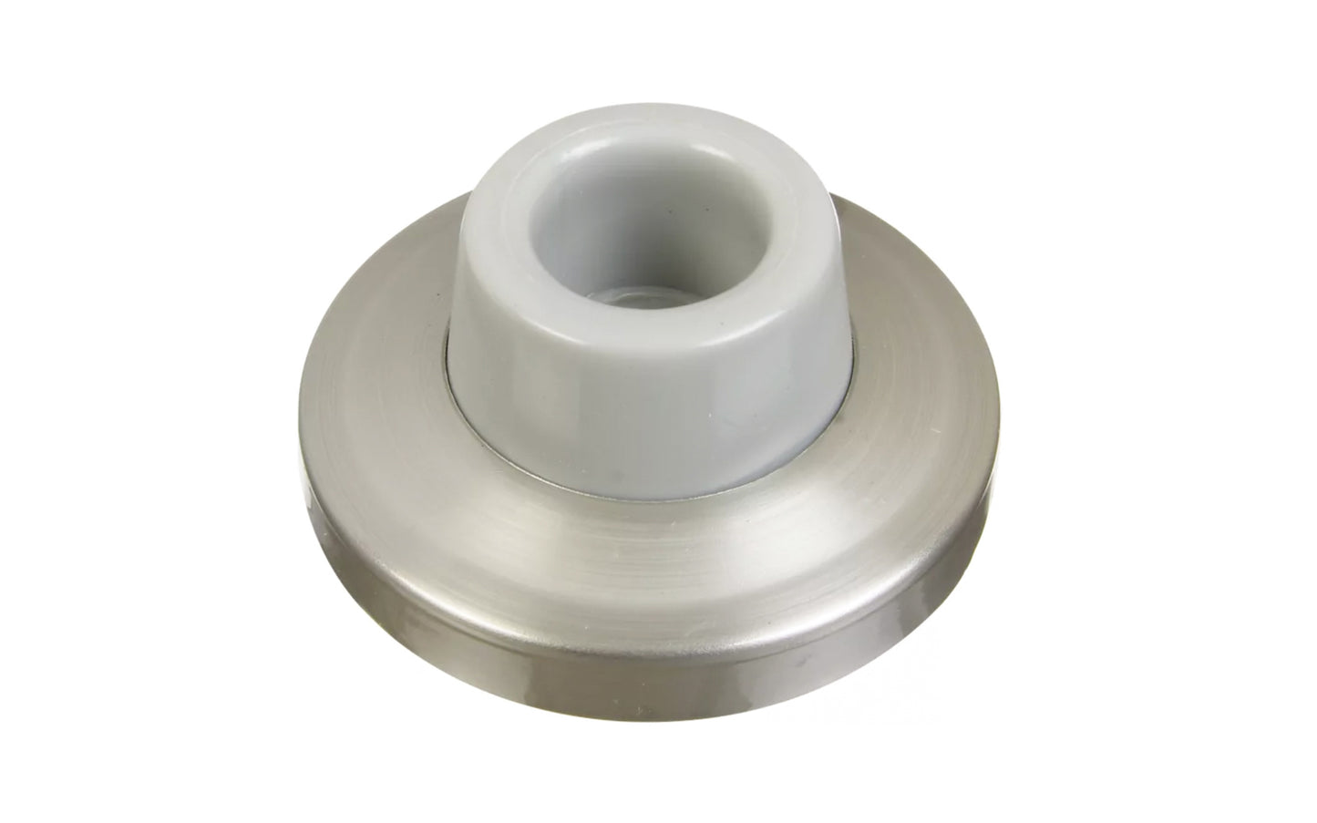 • This wall door stop is designed to protect walls & doors from damage. Satin nickel finish on solid brass material. Base Diameter: 2-5/16". Projection: 1-1/8". Made by National Hardware. Model N326-983.