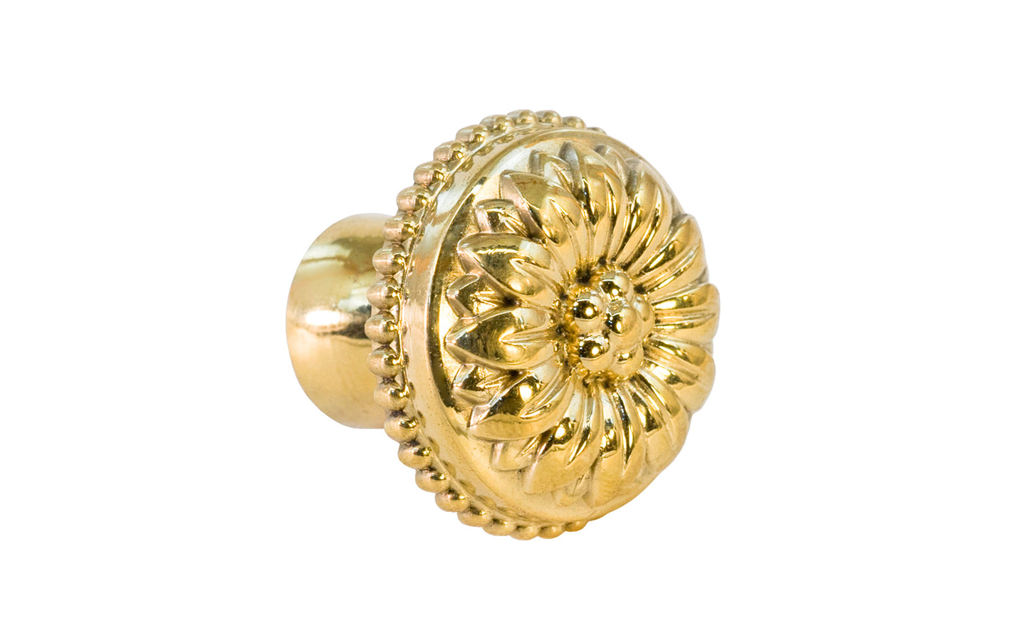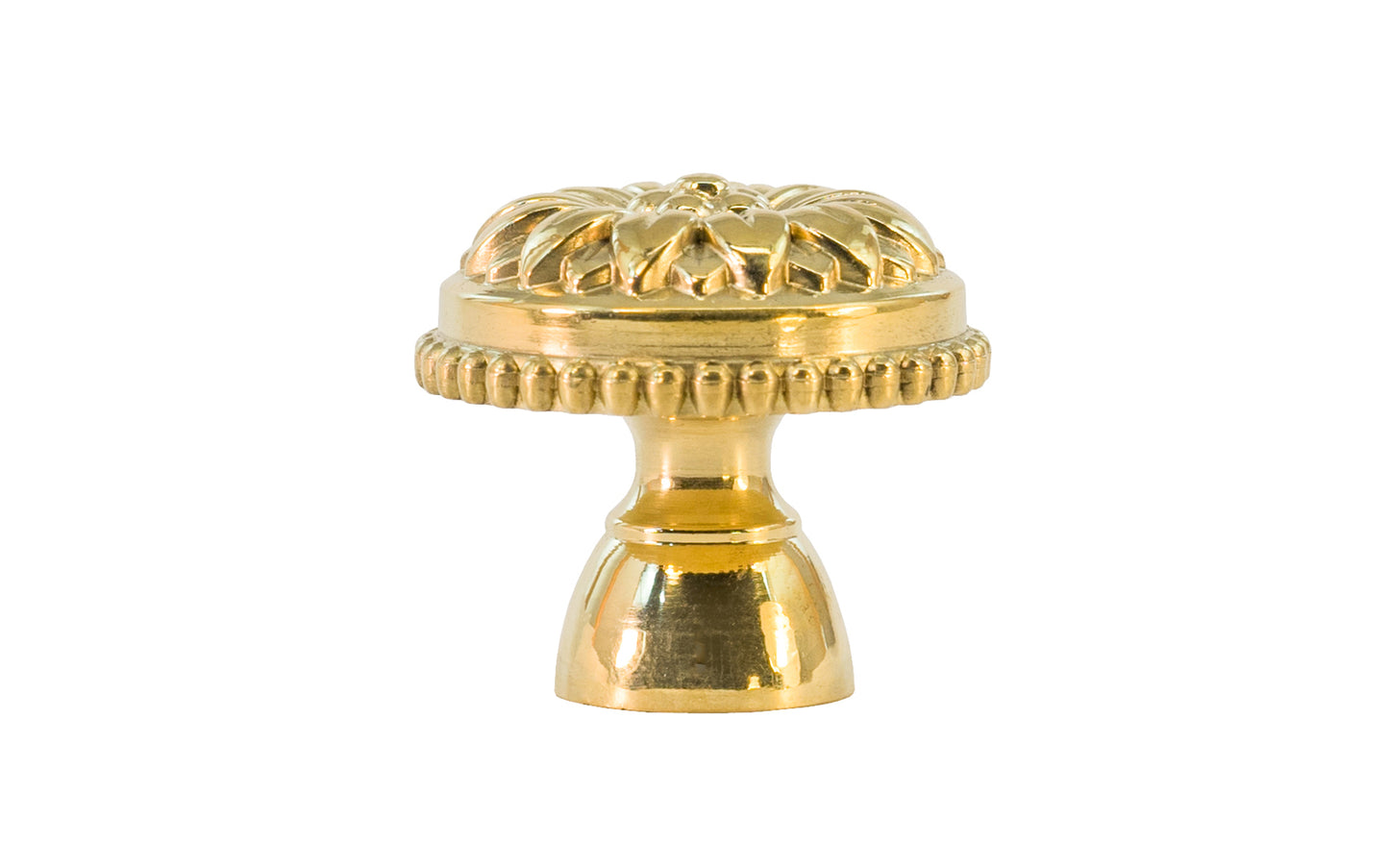 A traditional & classic "French Style" cabinet knob with an elegant flower design & beaded trim. Made of high quality solid brass, This knob has a weighty & durable feel to it. Great for cabinets, furniture & drawers. The knob is designed in the Late 19th Century style of hardware. Non-Lacquered Brass (the un-lacquered brass will patina over time).Hardwick & Sons is pleased to offer vintage-style hardware for the many people who desire to fashion their homes with charm, quality, & style. The traditional-style hardware that we showcase are true & faithful reproductions of classic hardware pieces found in the many homes from across America throughout the past century.
