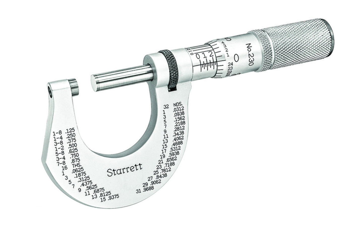 Starrett 230 & 230M Outside Micrometer includes 0-1" range, friction thimble, lock nut, carbide face, 0-1" Range, .0001" Grad, Carbide Faces, Friction Thimble, Lock Nut. Made in USA. -