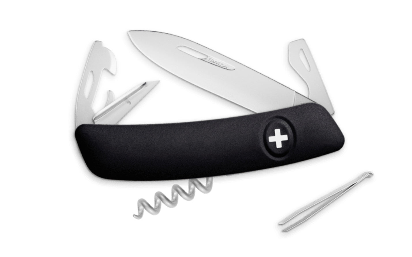 Swiza D03 Black Swiss Multi-Tool Knife. 3-3/4" closed length. Includes 75 mm blade, blade lock, reamer/punch, sewing awl, bottle opener, #3 slotted screwdriver, #1 slotted screwdriver, can opener, wire bender, cork screw, #1 phillips screwdriver, tweezers.From the Manufacturer: