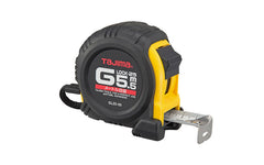 A locking & shock resistant measuring tape made by Tajima Tool. This G-series tape measure has an advanced "Hyper-Acry-Coat" tape coating with a triple-riveted end hook & a cushioned end hook return. The non-slip elastomer cover in the armored case protects the tape & work surfaces. 1" wide, high contrast & visible white blade. -