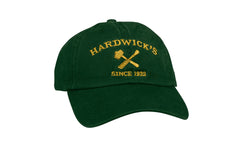 The classic "Hardwick's" hat. Made of 100% soft washed cotton, this cap is comfortable & looks great. The hat color is an attractive dark green with an embroidered gold lettering print. It has a fabric back strap that is finished with a brass buckle & a stitched-slit tuck to give this cap a nice look. The visor is pre-curved with eight rows of stitching & sewn eyelets. Adjustable sizing to fit small & big heads. Baseball cap style hat. "Hardwick's" Since 1932.