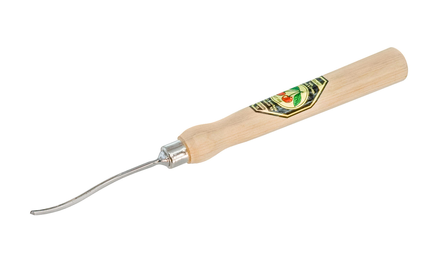 • A 0.5 mm Micro Carving Curved Deep Gouge made by Two Cherries in Germany. It has an curve in the length of the blade with the cutting bevel on the outside. This micro gouge is great for fine detail carving. No. 11 Sweep for deep curved micro gouge.   Made in Germany.