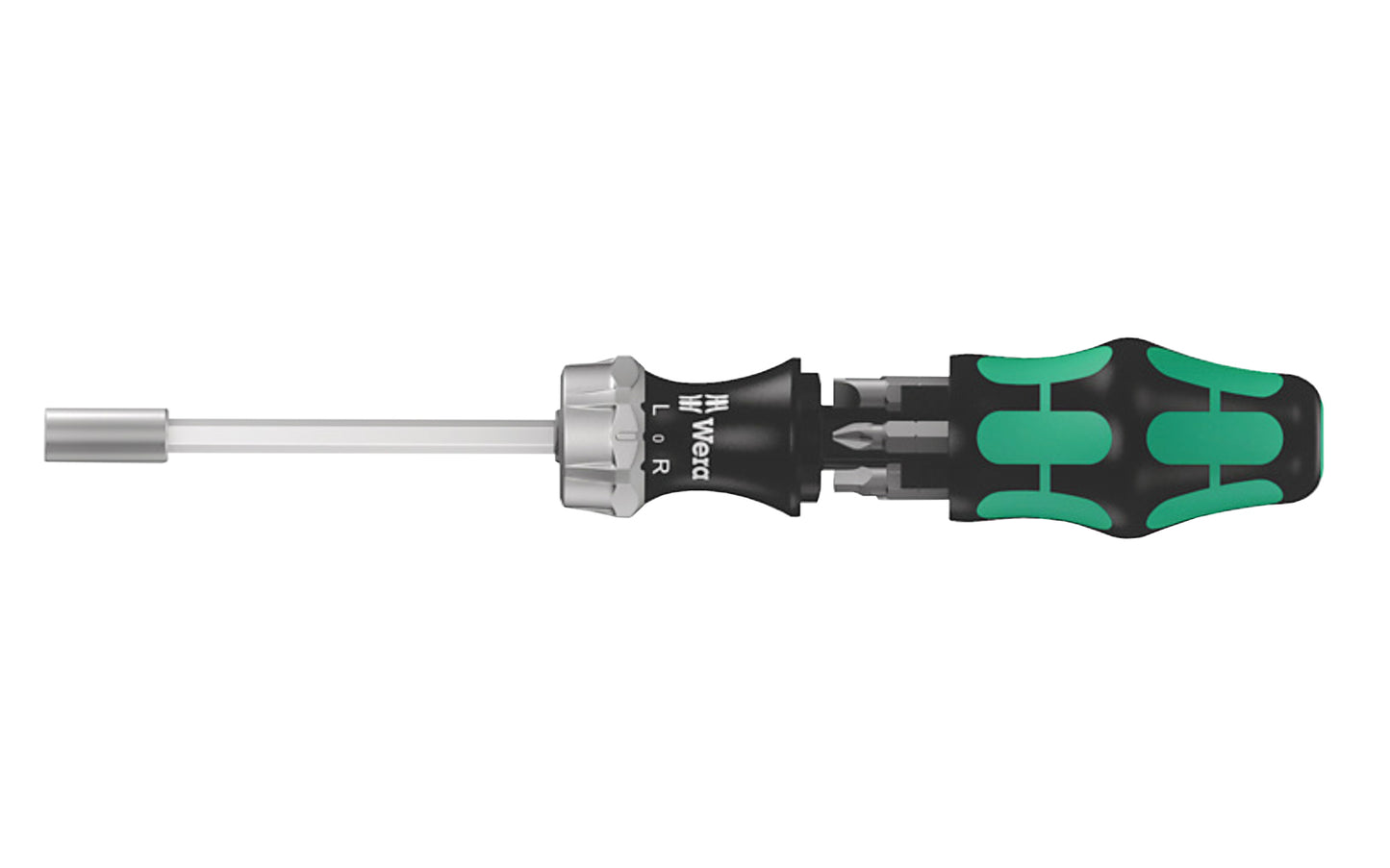 Wera Screwdriver Set & Bits - "Kraftform Kompakt 27 RA 2". Wera compact tool with multi-component Kraftform handle for high working speeds and particularly ergonomic screwdriving. Integrated bit magazine in the handle. Includes ratchet: fine-pitched for small return angle, switchover ring (right, fixed, left), maximum torque of up to 50 Nm; hexagonal blade with ¼" hexagon socket take-up, stainless sleeve, strong permanent magnet. Made in Czech Republic. -