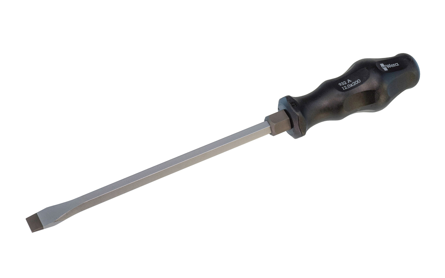 High quality Heavy Duty Wera Slotted Screwdriver. Designed for screwdriving, chiseling, mortising and slackening stuck screws. With multi-component Kraftform handle for fast and smooth work. Kraftform Plus: Hard handle zones for high working speeds, while soft handle zones guarantee a high torque transfer. The pound-thru hexagonal blade made of premium bit material ensures power transmission without loss even at hammer blows. Tough tempered material to prevent the blade from splintering or breaking. With integrated impact cap to increase service life and reduce risk of splintering. Higher torques can be transmitted with open-end or ring spanners using the integrated hexagonal wrench aid. The Wera Black Point tip and a sophisticated hardening process guarantee a long usability for the tip, increased corrosion protection and exact fitting accuracy. With hexagon anti-roll protection to avoid bits from rolling away annoyingly in the workplace. Made in Czech Republic. Kraftform Series 932 A screwdrivers. -