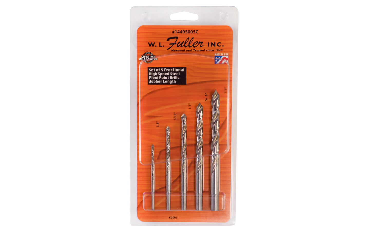 A high quality 5-piece HSS Plexi-Point drill bits with round shank by WL Fuller. These drill bits are specially pointed to reduce chipping out when cutting through Plexiglass. Designed to avoid chatter while drilling and will not melt the material. These points produce clean holes in soft & hard plastics, as well as some composites. Fractional SAE sizes: 1/8", 3/16", 1/4", 5/16", 3/8". High Speed Steel. Model No. 14495005C. Made in USA.The W.L. Fuller Co. is a family owned, third generation manufacturer of the best countersinks, counterbores, plug cutters, taper point drills, brad point drills, & step drills. All made 100% in the U.S.A. today. With over 60 years experience manufacturing tools to cut woods, plastics, & metals, Fuller provides tools you need to get the job done while saving you time & money. All of their products carry their “satisfaction guarantee”.